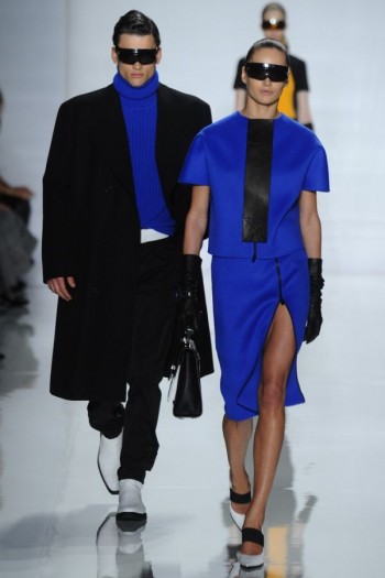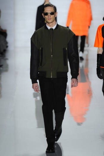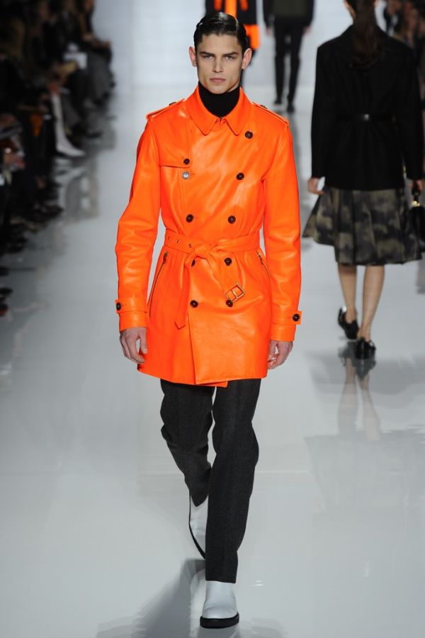 Polished Urban Essentials–American designer Michael Kors looks to the bright city lights and fast-paced urban living for the inspiration of his fall/winter 2013 collection. Marrying the attitude of the city with an uptown flair, a sharp range of black menswear essentials are juxtaposed with colorful garments reflecting neon orange, taxicab yellow and royal blue. Mixed with urban grit in the form of camouflage and heat-sealed closures, tailoring and quilting come together for a collection that screams right now.