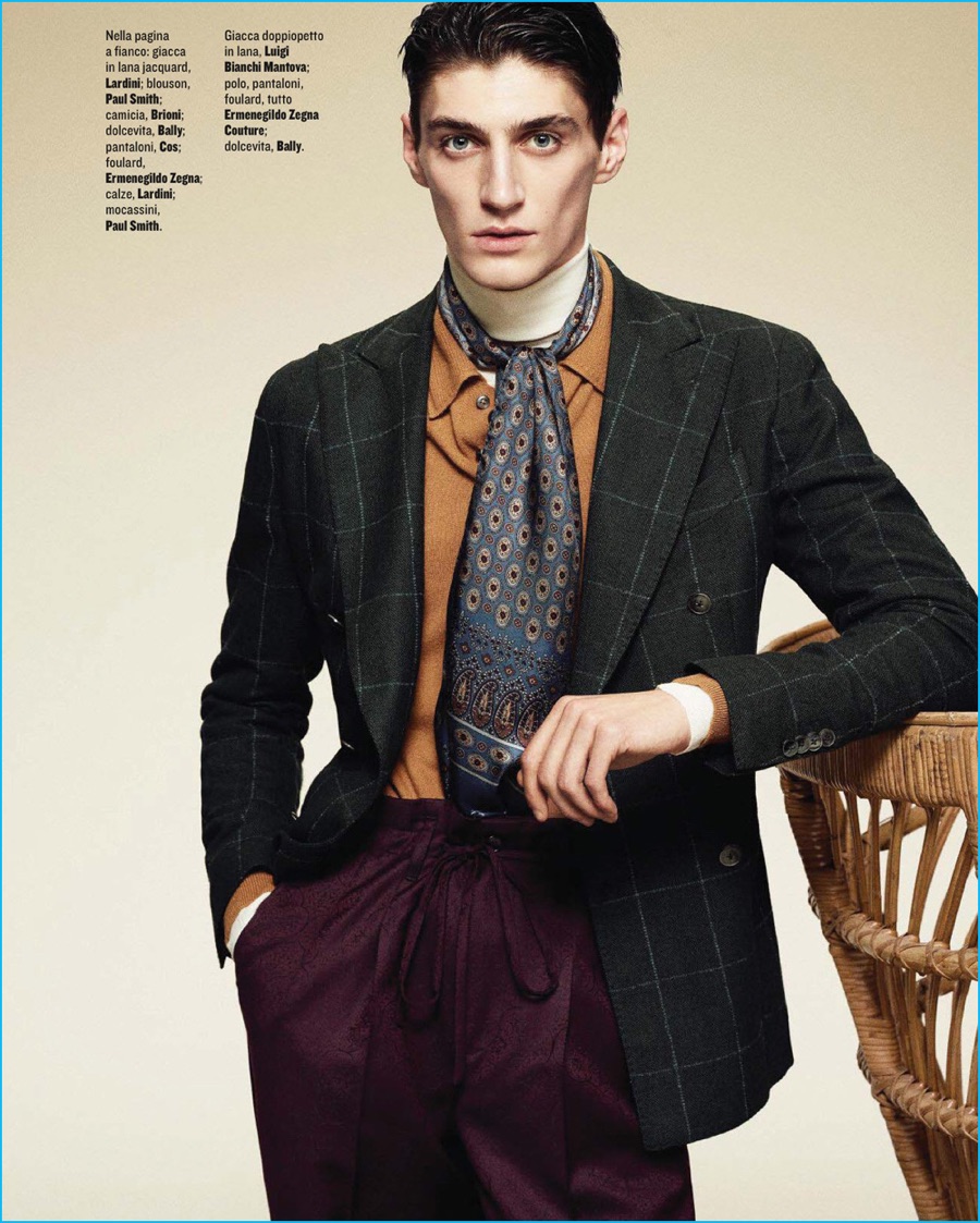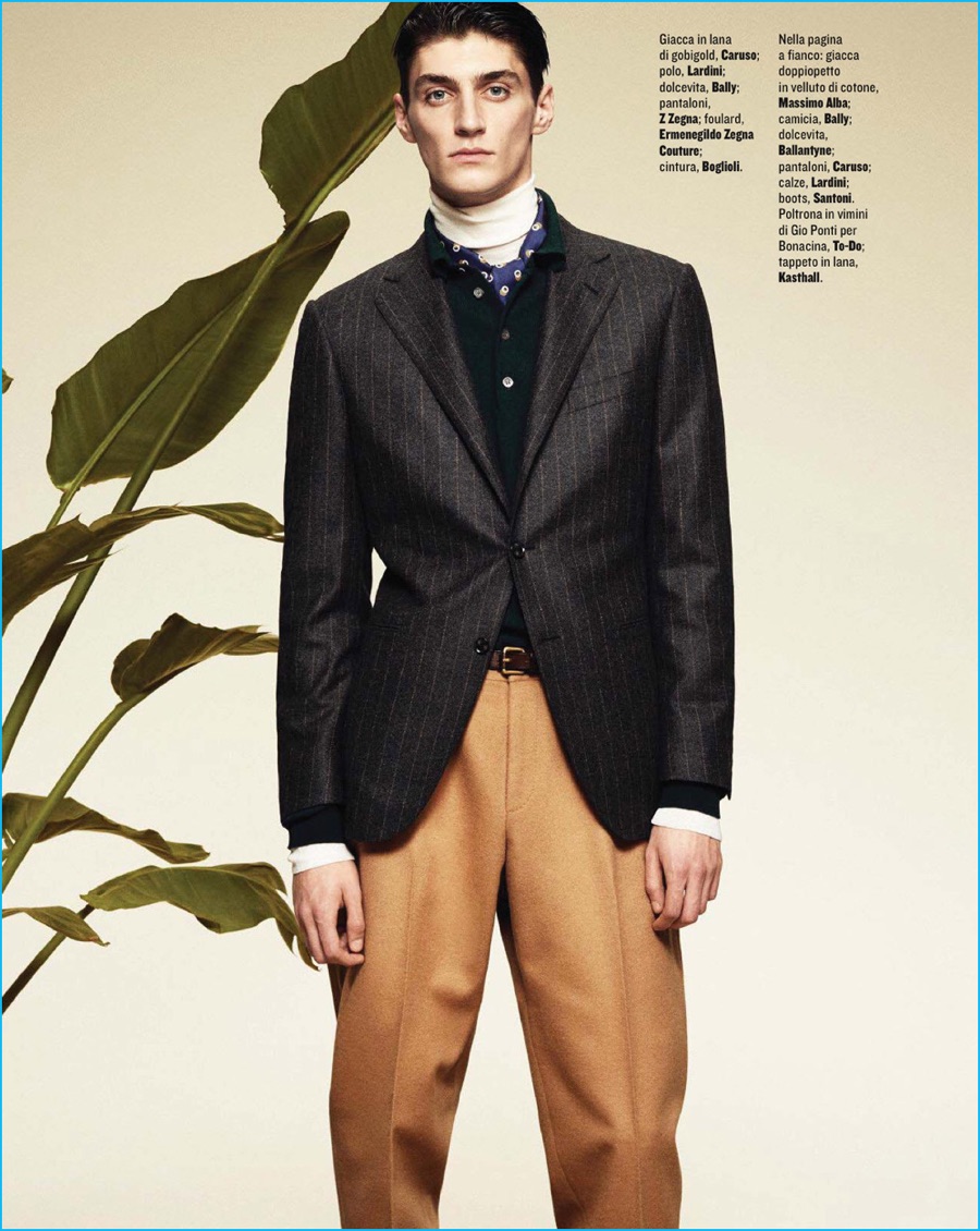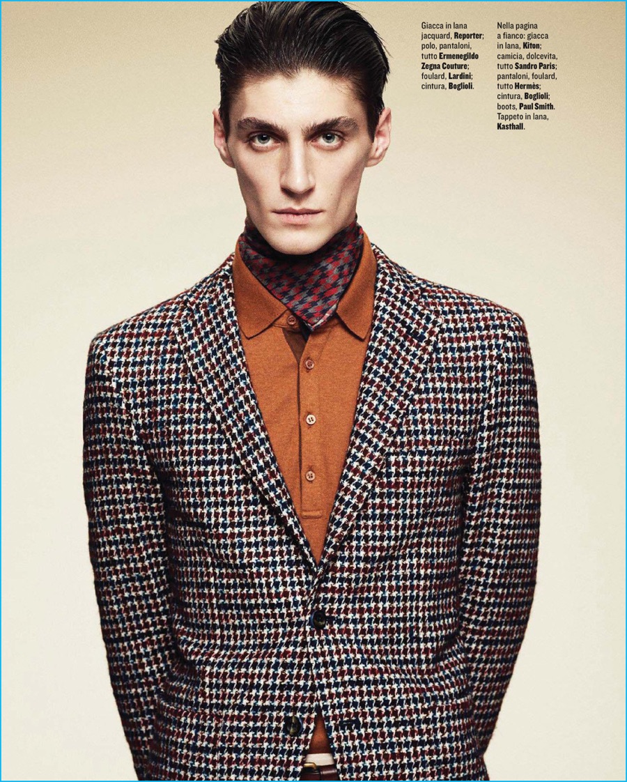 Style Italia tackles men’s tailoring for a fashion editorial by photographer Letizia Ragno. Championing luxurious separates from brands such as Ermenegildo Zegna Couture, Bally and Caruso, stylist Luca Roscini outfits model Mihai Bran. Presenting a dapper fall wardrobe, the photo shoot features dynamic layers. Remixing the typical suit, patterned sportcoats are paired with polos, foulards, lightweight sporty jackets and dashing dress shirts.