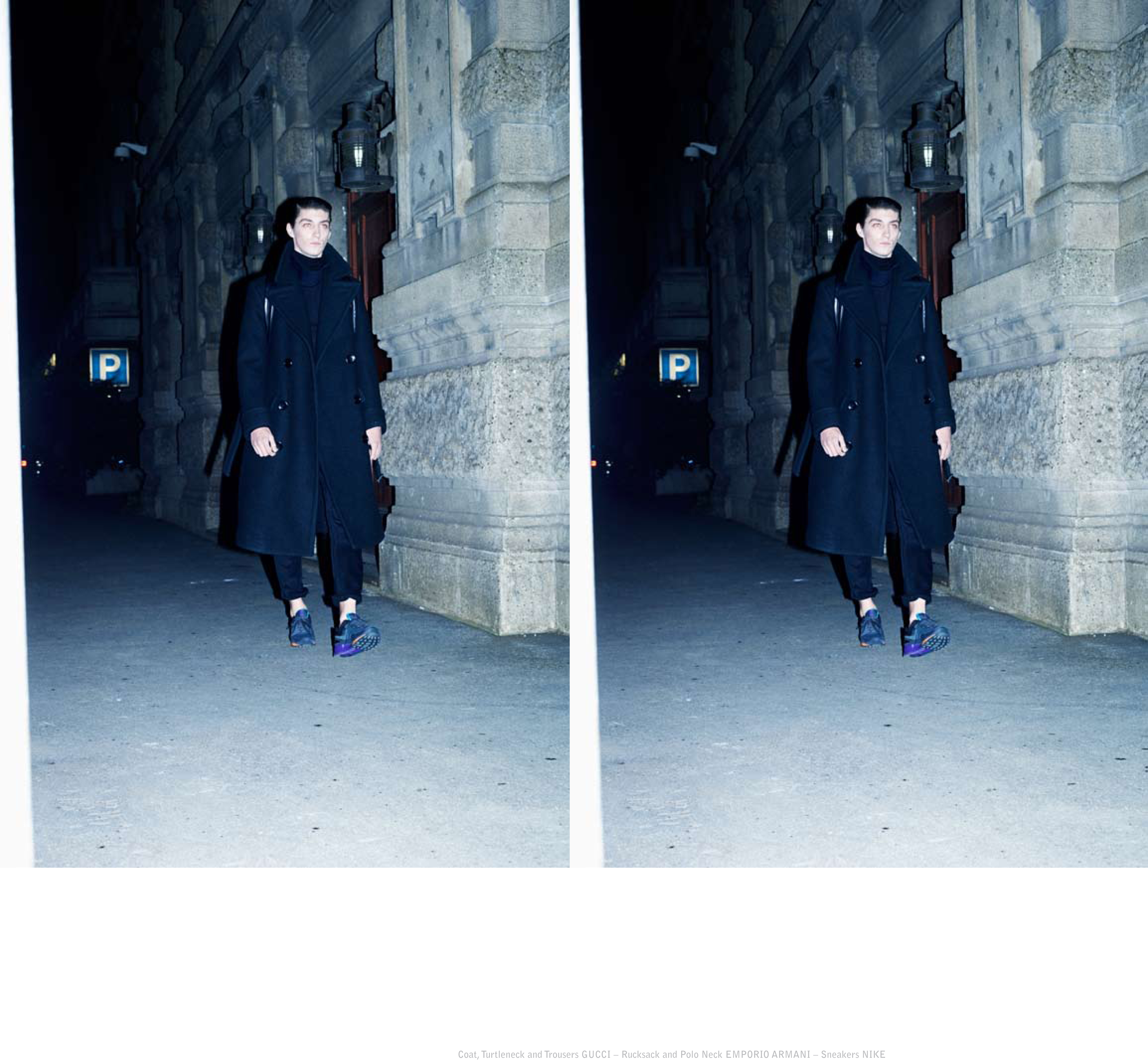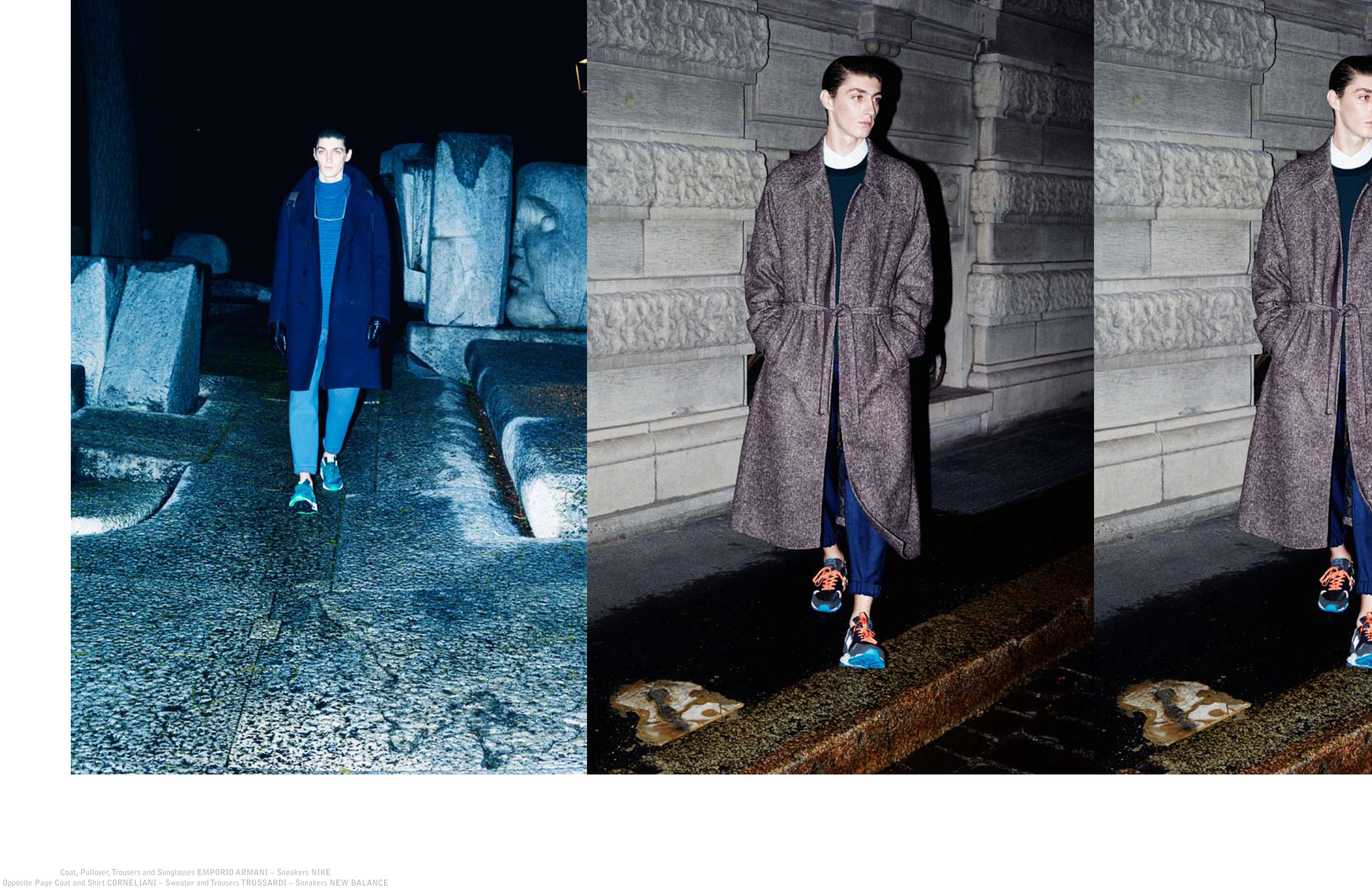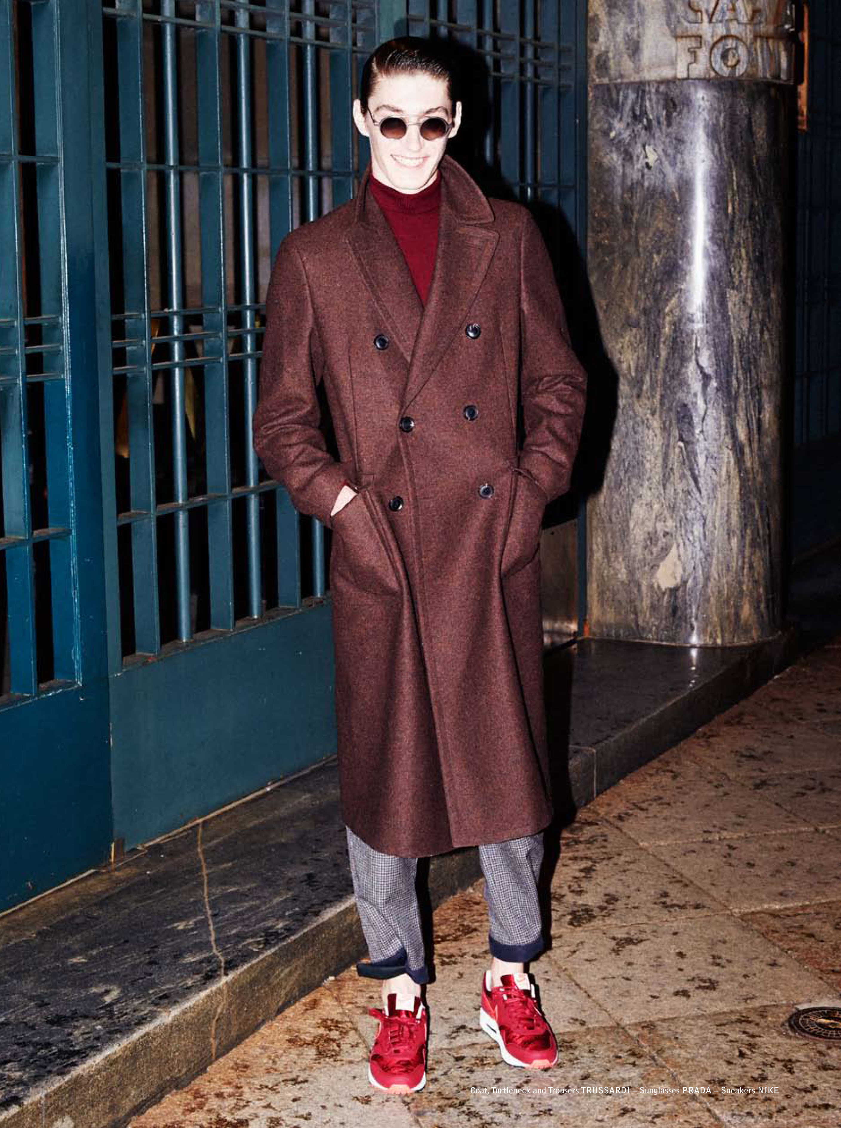 Coats Revamped-Photographer Massimo Pamparana sets his sights on new face Mihai Bran (L’Uomo Elite) for a story featured in the latest issue of The Greatest. For the fashion story, fashion editor Carlo Ortenzi focuses the attention on winter’s best coats. From classic volumes, to luxurious fur details and elaborated motifs that decorate this essential garment, Ortenzi matches different coats with colorful sneakers, textured sweaters and skinny trousers, in order to give them a sportswear-oriented vibe. / Hair by Paolo Soffiatti. Makeup by Mary Cesardi.