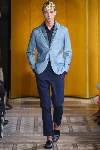 A Bird’s Tale–Miharayasuhiro takes flight for spring/summer 2014, weaving a feather motif into the season’s tapestry. Bringing together intricate feather prints and variations of blue and red, the narrative is as clear as the wardrobe is streamlined for a comfortable fit. Flannel shorts imitate a wrap around shirt while various shirting options are layered for an easy takeaway. Embracing both slender cuts and loose silhouettes, Miharayasuhiro touches upon streetwear with printed sweatshirts, lightweight jackets and more, adding a degree of refined accessibility to the lineup.