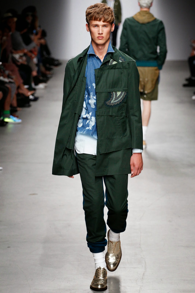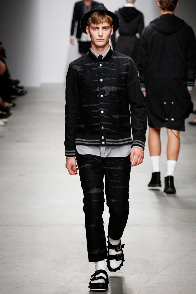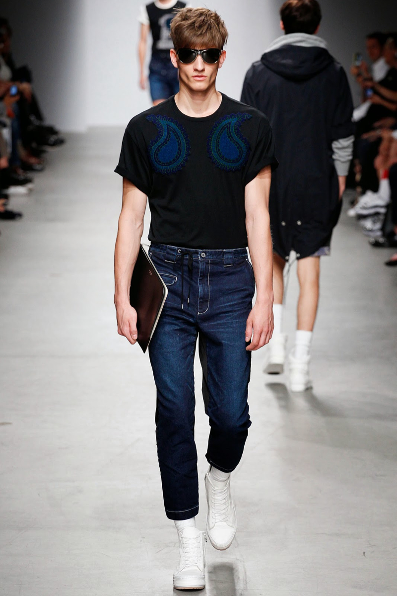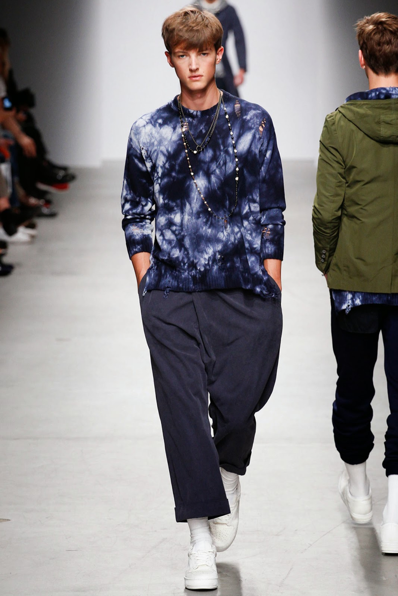 Miharaysuhiro Spring/Summer 2015–This season’s denim trend fit right in at Miharayasuhiro, where the essential showed up in its classic form, rounding out a youthful lineup that played with prints and varying proportions. Coordinated ensembles with narrow silhouettes acted as the groundwork for the show, which included a casual wardrobe of sweatshirts in tie-dye and leopard prints. Following layered cardigans in more intriguing patterns, tattered blazers and bomber jackets gave the collection a neat edge.