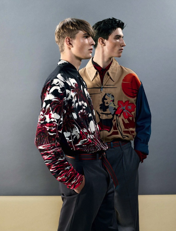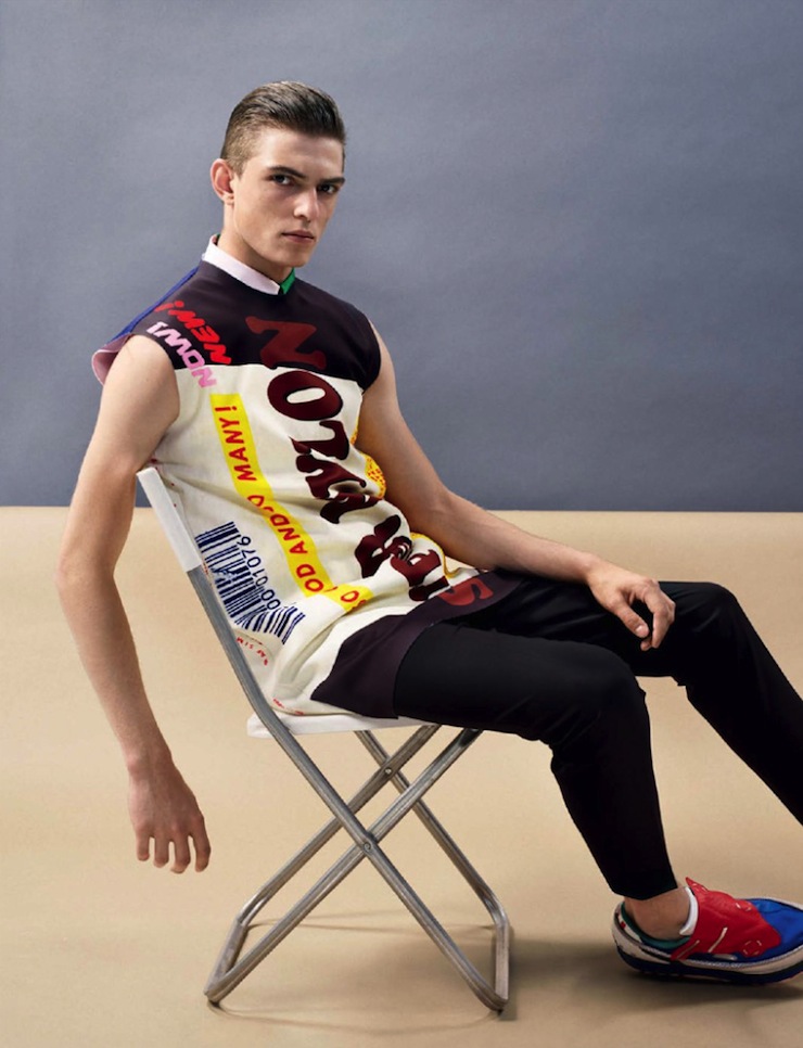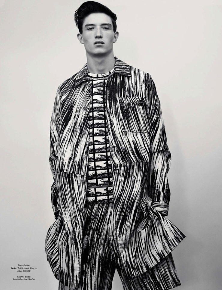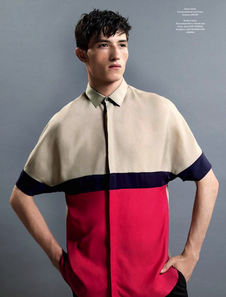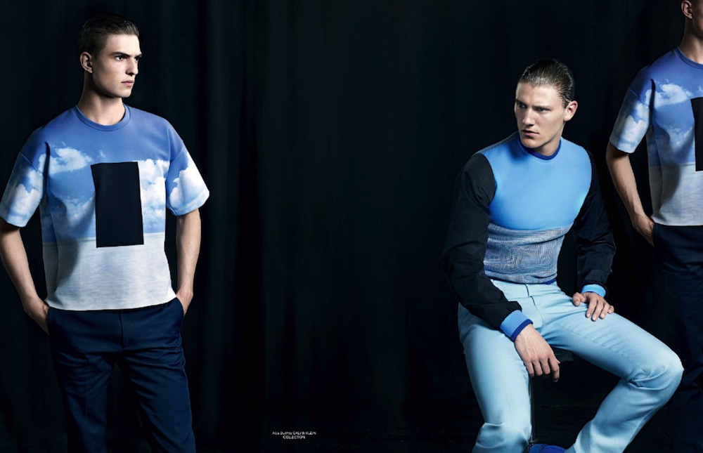 Fast Forward–The fall/winter 2013 issue of German GQ Style gives us a preview of some of the boldest styles included in the spring 2014 collections of luxury labels, such as Givenchy, Gucci, Calvin Klein Collection, and others, as displayed by this fashion story, lensed by David Slijper. The magazine’s fashion director, Tobias Frericks, dresses models Mikkel Jensen (Kult), Jester White (Select) and Guerrino Santulliana (Nathalie) in fashionable ensembles, combining graphic color blocking styles with elaborate prints, abstract patterns or motifs inspired by pop art, defining a wardrobe that certainly drives away boredom. / Photography assistance by Roo Kendall. Hair and makeup by Johnnie Sapong (Jed Root).