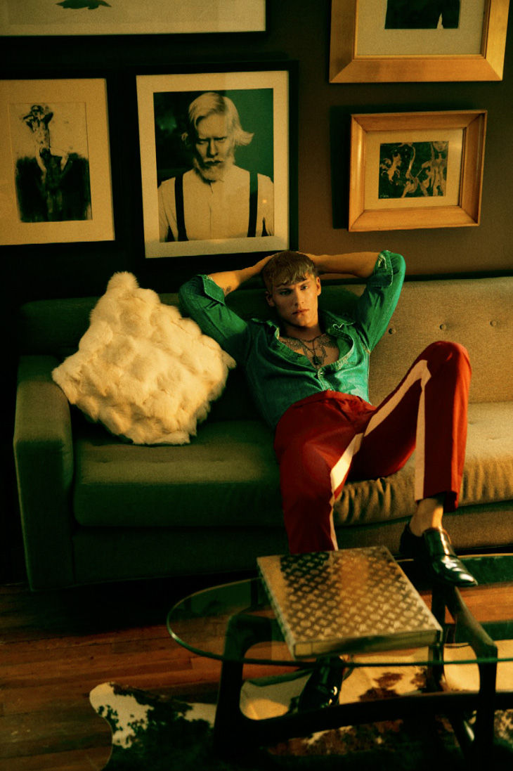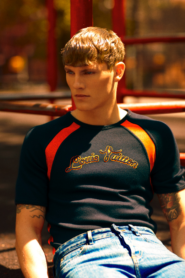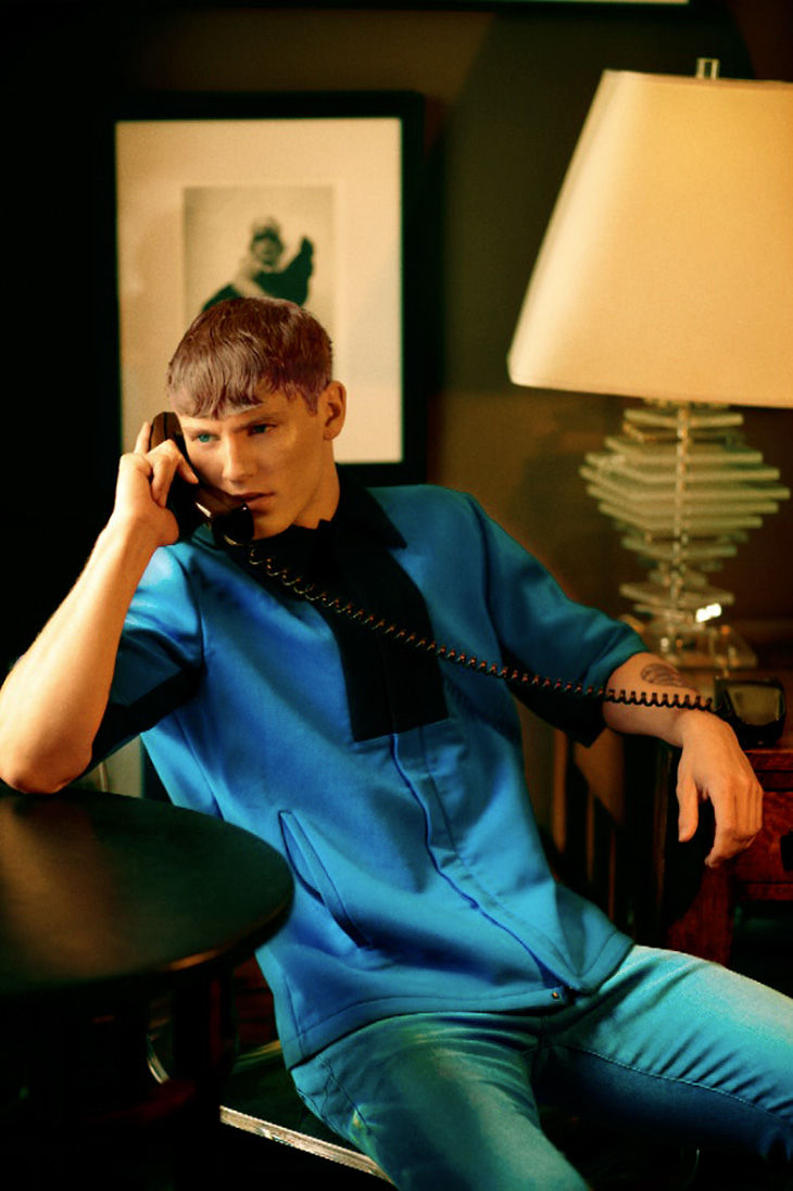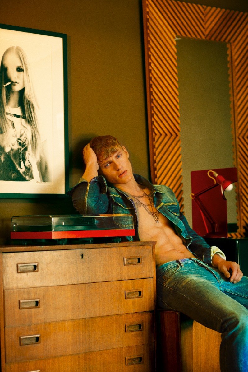 Unexpectedly Modern–Photographed by Arnaldo Anaya-Lucca for the latest issue of DSection, Danish model Mikkel Jensen stars in a stunning spread, reminiscent of the 70’s. Styled by Joseph Episcopo in pieces from the likes of Louis Vuitton, Prada, Emporio Armani and other prestigious menswear labels, the Soul model unveils a multifaceted wardrobe where scuba inspired designs, see-through styles and striped numbers alternate with timeless denim pieces and basic tank tops, proving that this season is all about mixing inspirations. / Hair by Eric Jamieson. Makeup by Quinn Murph.