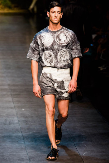 With this Dolce & Gabbana look, prints begin to migrate from just tops to bottoms as well, including pants, trousers, and accessories seen with other designers.