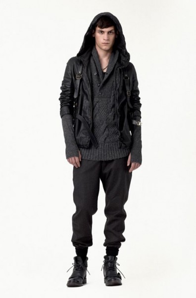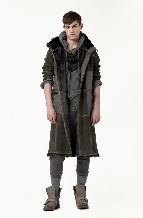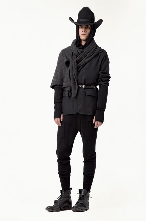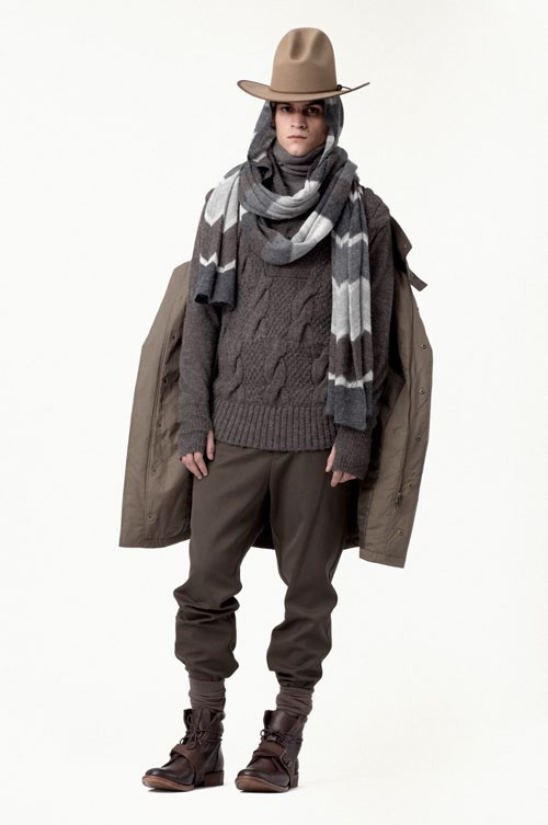 Western Mode–Stepping out for Nicholas K’s fall/winter 2012 outing, DNA model Miles Garber is clad in the label’s latest collection of easy to wear separates. Filtering their signature aesthetic through a western motif this season, Nicholas K achieves an effortless cool. Featuring neutral color-ways, the lineup begins with comforting fits in the form of loose-cut pants that act as the perfect complement to endless layers. Mixing draped silhouettes, particularly with outerwear and finer details such as elongated sleeves, complete with hand loops as well as cable-knit pieces, conclusive to a variety of functions, Nicholas K serves up a well-rounded season.