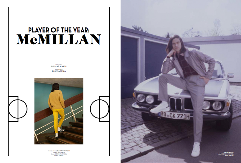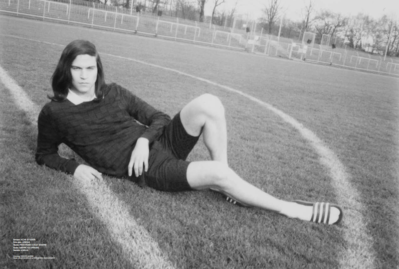 Retro Vibe–Playing the role of a 70’s football player, model Miles McMillan (Nest) graces the pages of the latest issue of Sleek magazine, appearing before the lens of Juliane Spaete. Teaming up with fashion editor Lorena Maza, Spaete captures the American model in a vintage-inspired ed, where slim-fitted silhouettes, bold colors and shiny fabrics perfectly fit with the mood of the story. / Photo assistance by Jens Peter Randt. Grooming by Gregor Makris.