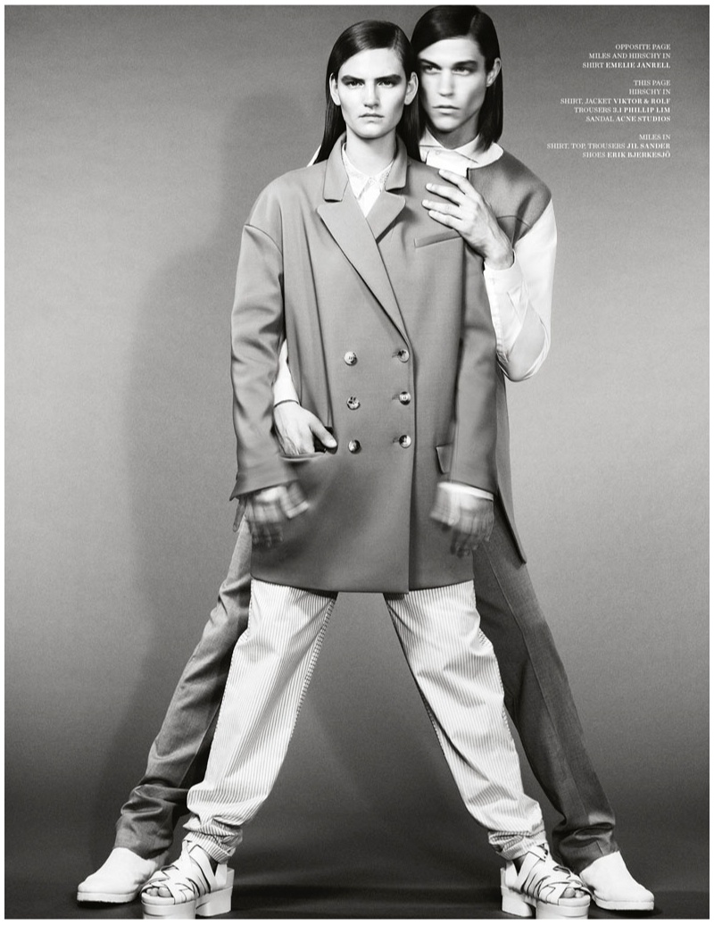 One Two One-Playing up Miles McMillan’s androgynous qualities, photographer Bjarne Jonasson shoots the model with Hirschy Hirschfelder for the most recent issue of SSAW. Featuring strong tailoring and sharp lines from Thom Browne, Marni and Prada, among other fashion brands, Miles and Hirschy are styled by Oscar Lange. / Hair by Erika Svedjevik. Makeup by Fredrik Stambro.