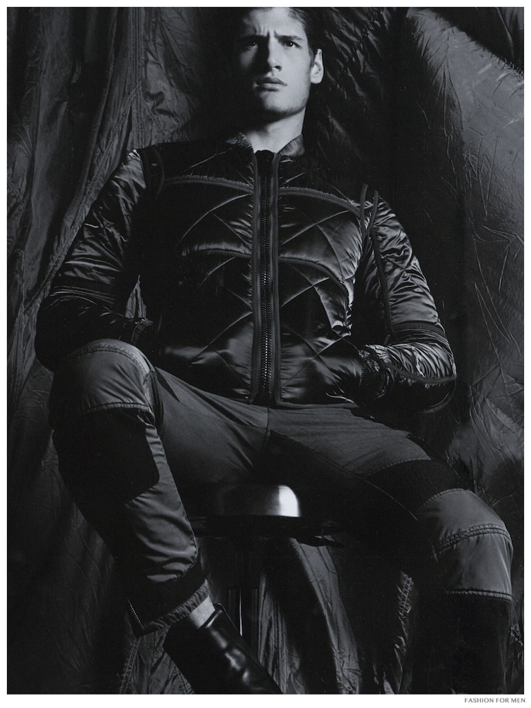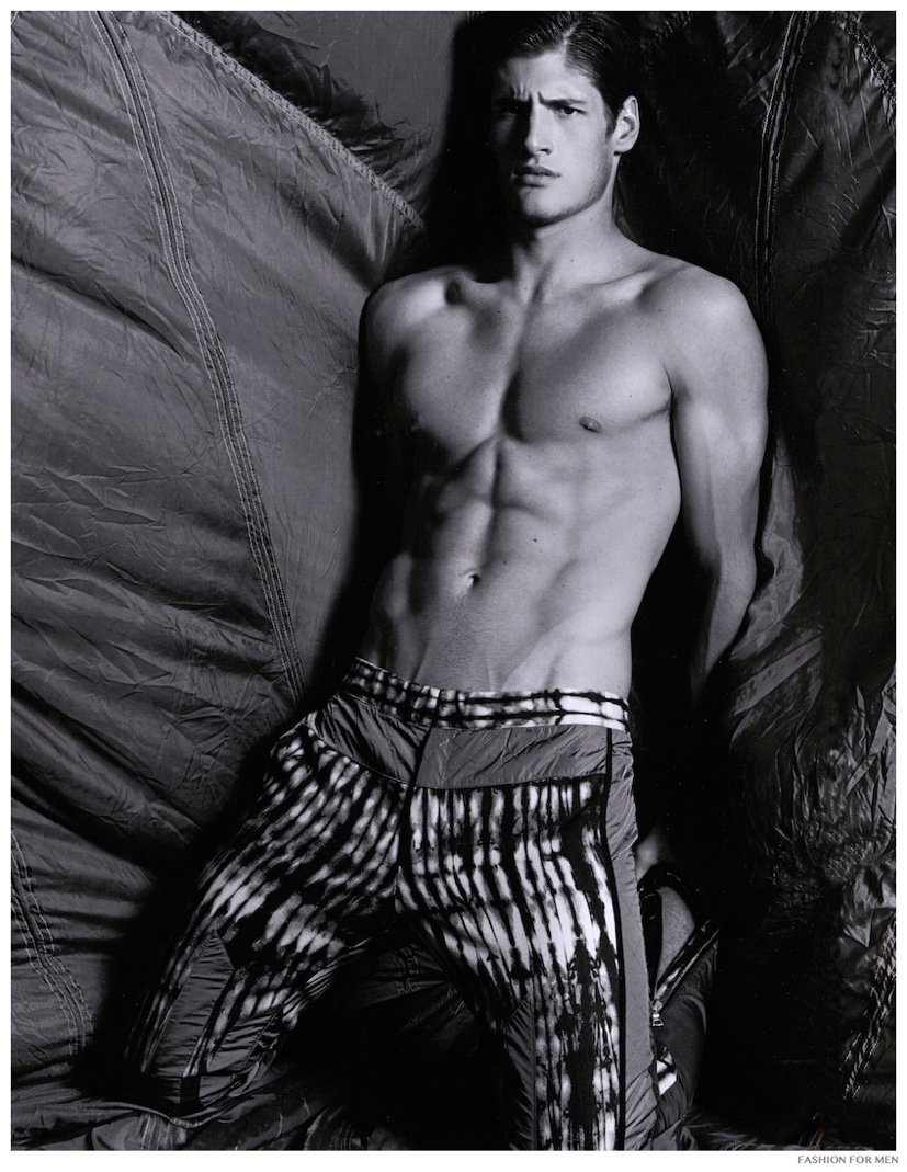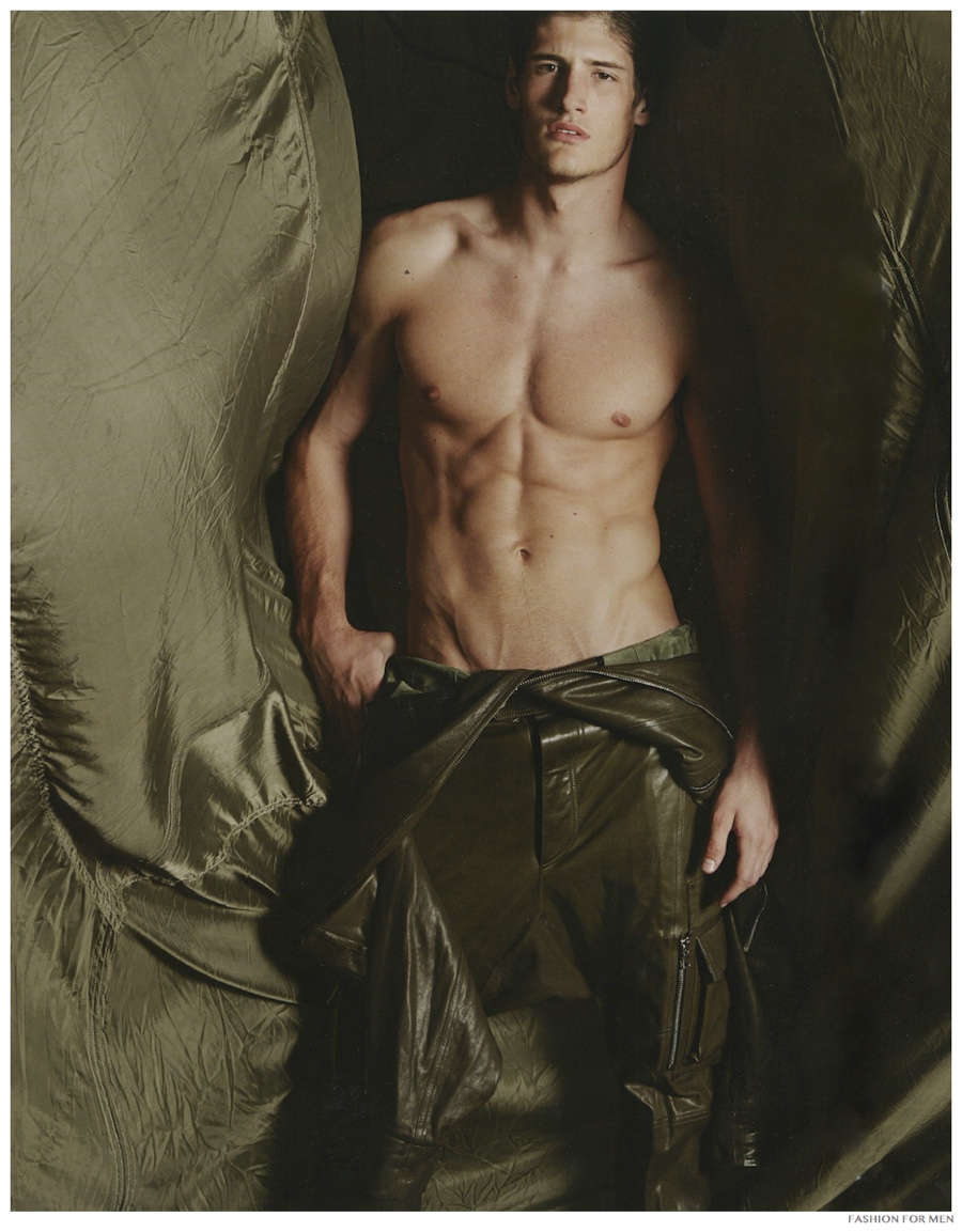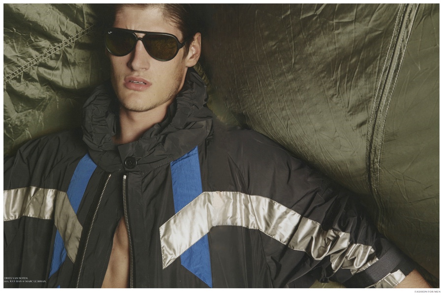 Active Military-Military-inspired fashions get a sporty overhaul with the latest spread to surface from the fall-winter 2014 edition of Fashion for Men. Photographer Milan Vukmirovic connects with Ford New York model up and comer Ryan Tift. Captured against a backdrop reminiscent of a parachute, Ryan models fashions with active silhouettes and military hues, showcasing looks from the likes of Dries Van Noten.