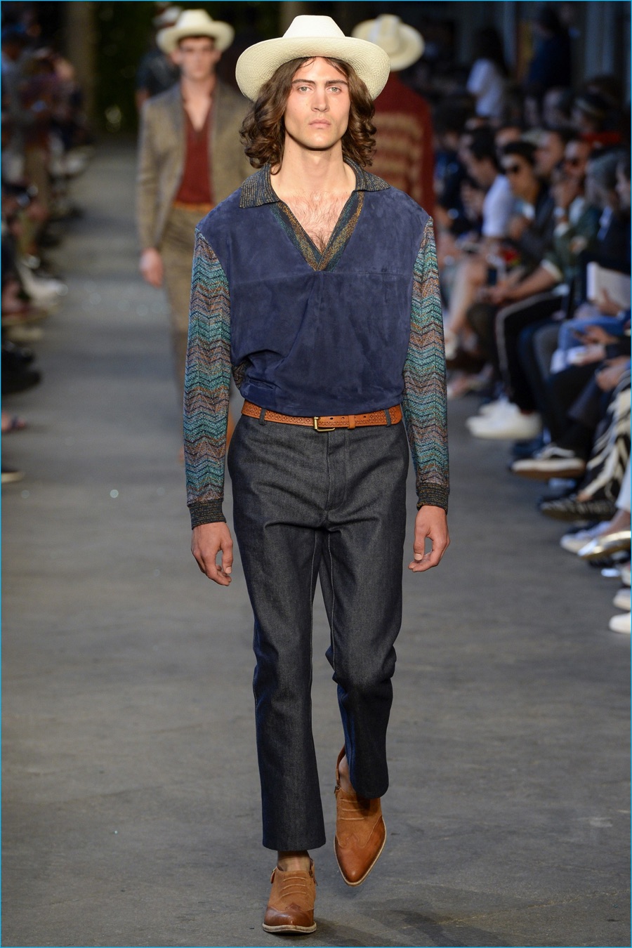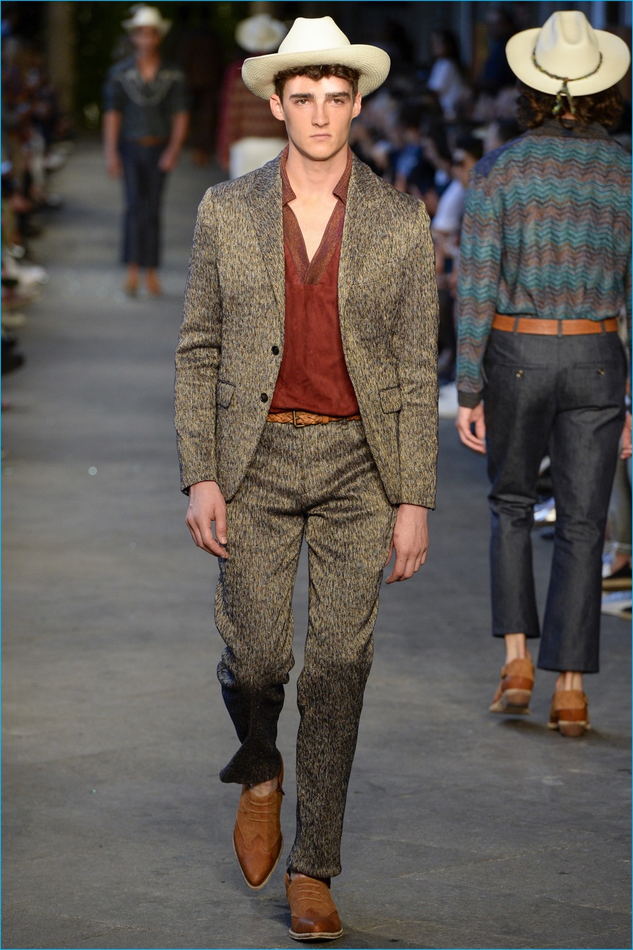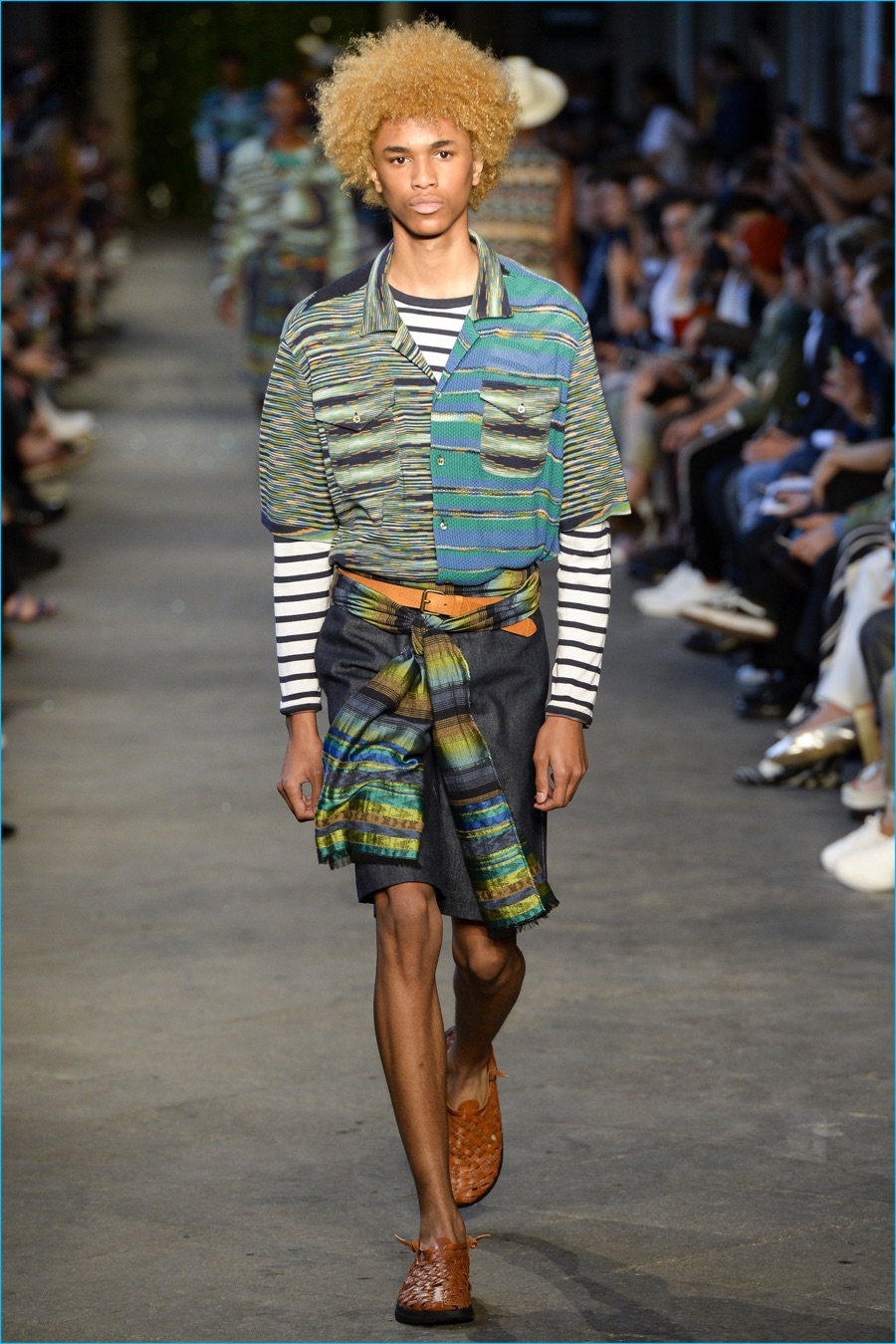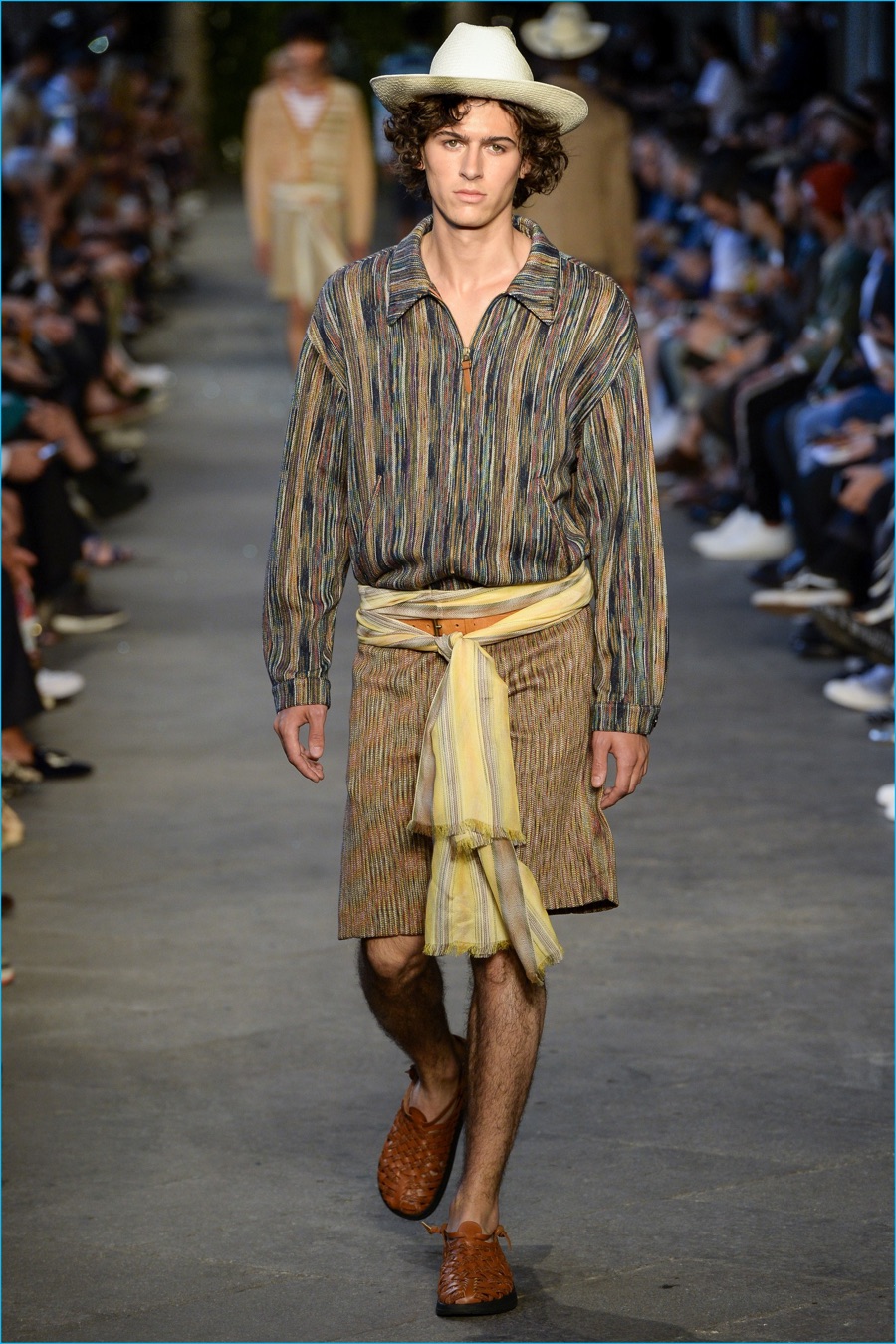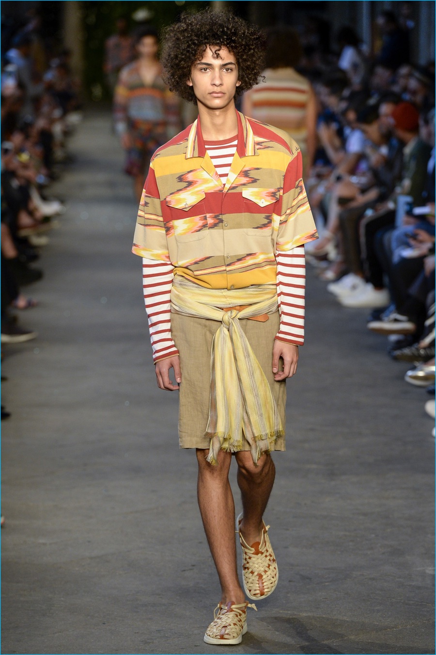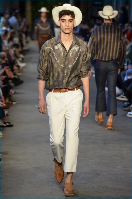 Models took to the catwalk in straw shoes and patterned shorts, finished with summer scarves, tied at the waist. Juxtaposed with long relaxed shorts, long-sleeve stripe tees and graphic button-downs, Missoni also introduced its take on the South American cowboy. The season was closed out with straight-cut trousers and a fresh spin on the western shirt.