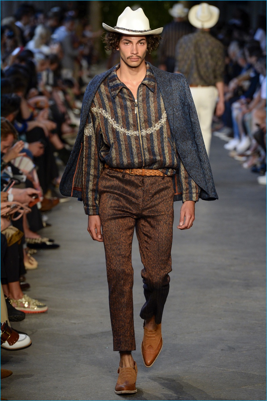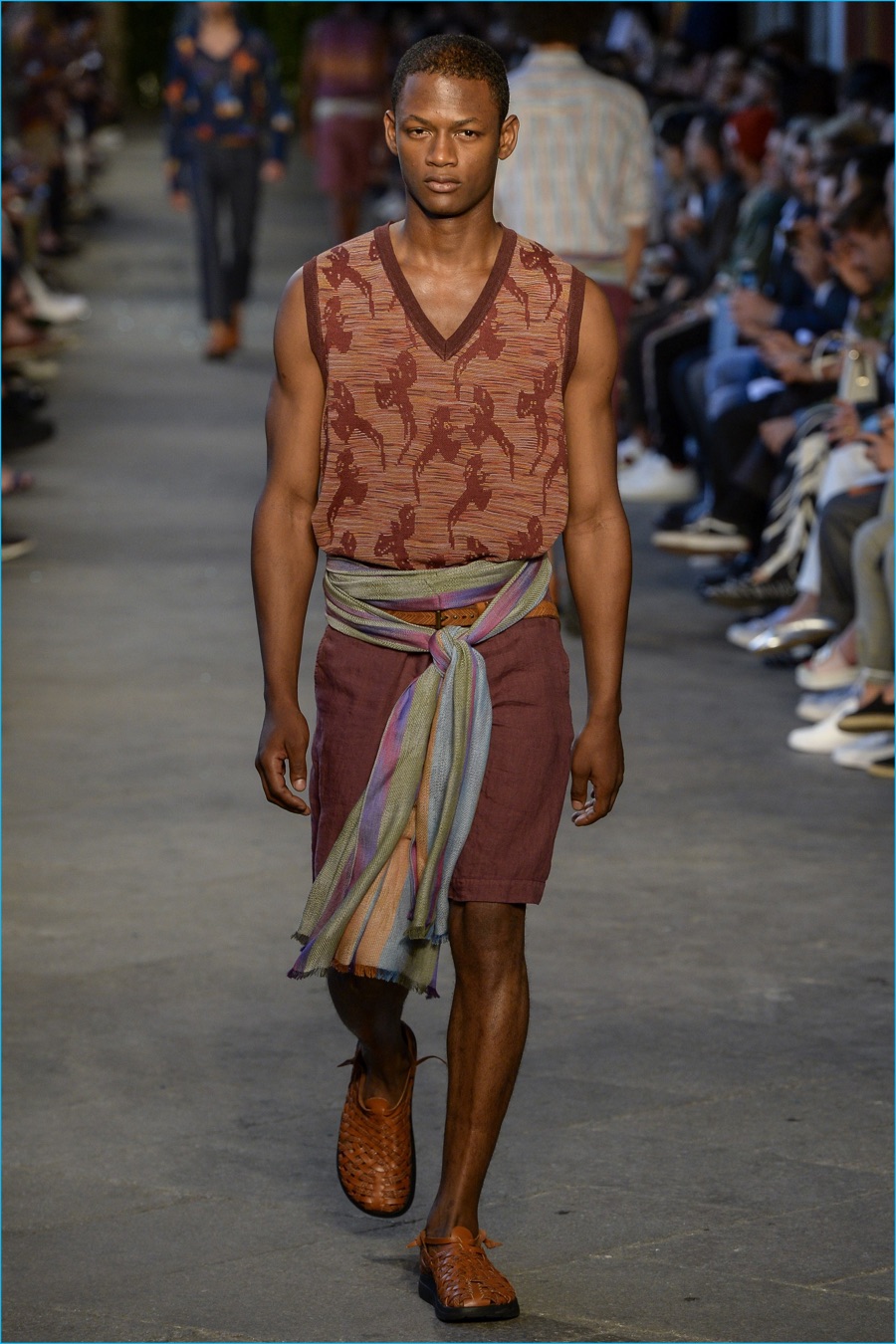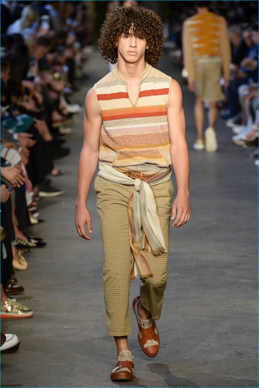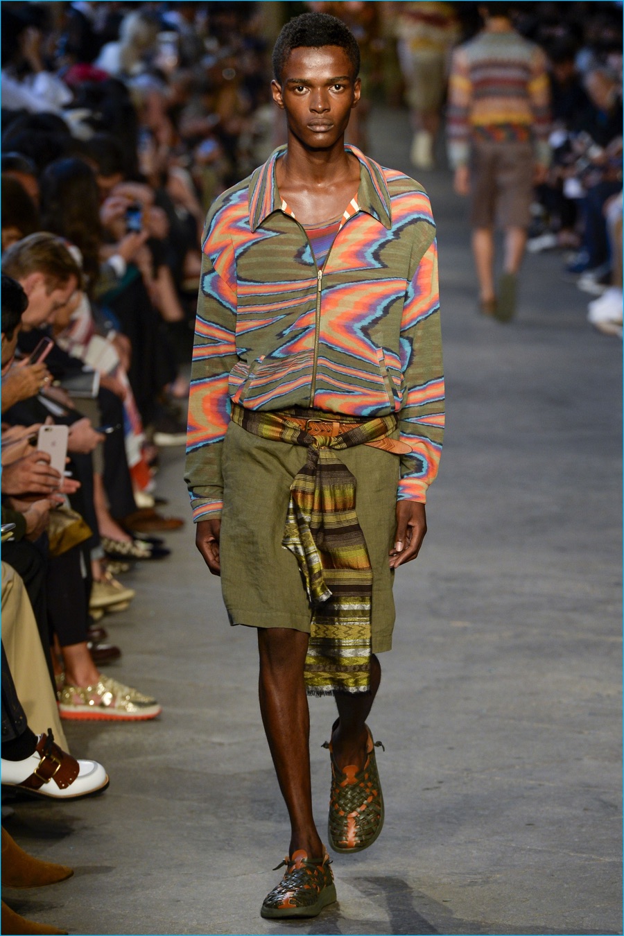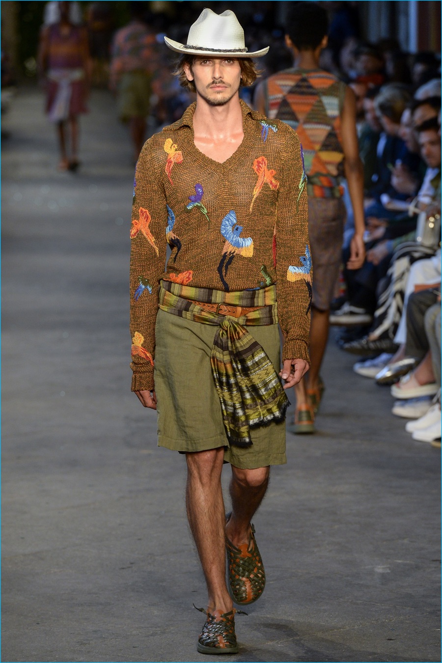 Models took to the catwalk in straw shoes and patterned shorts, finished with summer scarves, tied at the waist. Juxtaposed with long relaxed shorts, long-sleeve stripe tees and graphic button-downs, Missoni also introduced its take on the South American cowboy. The season was closed out with straight-cut trousers and a fresh spin on the western shirt.