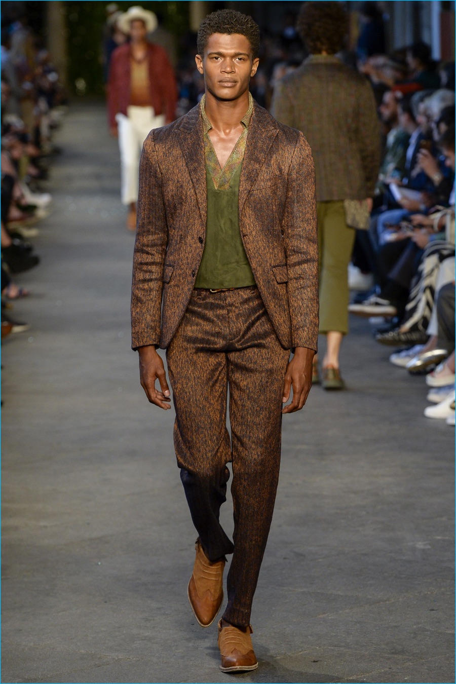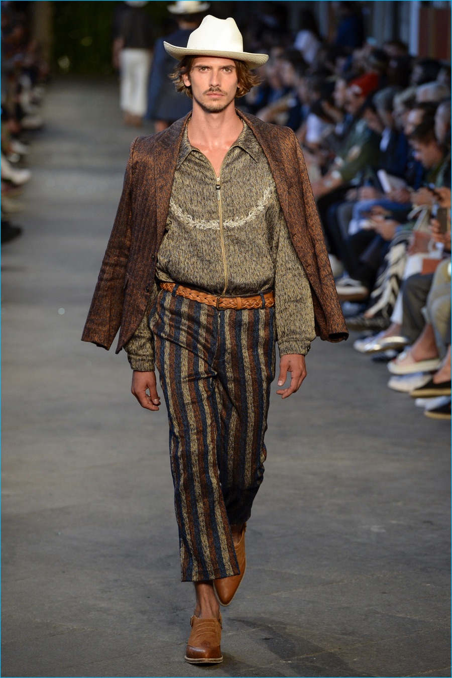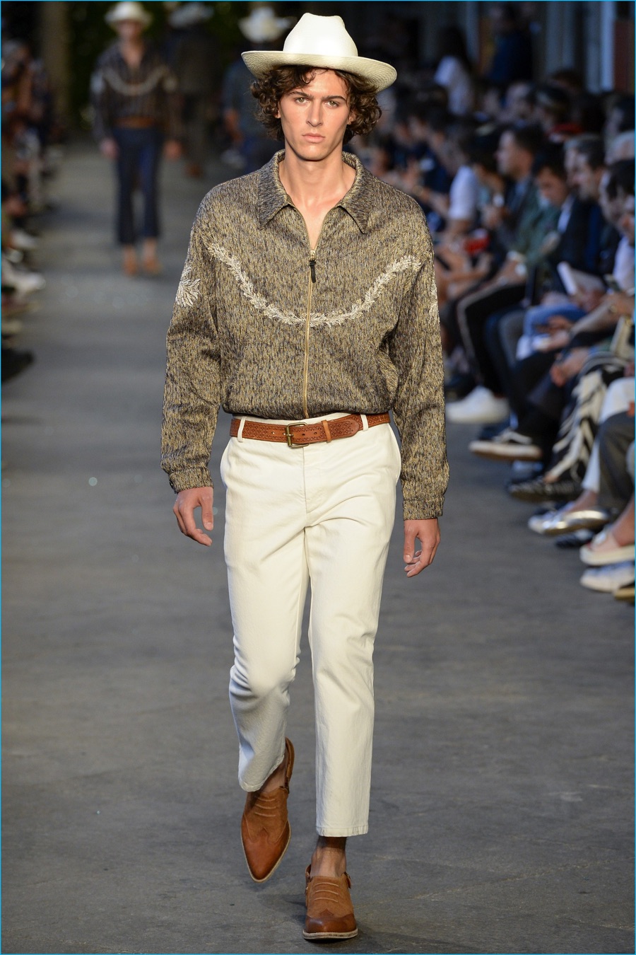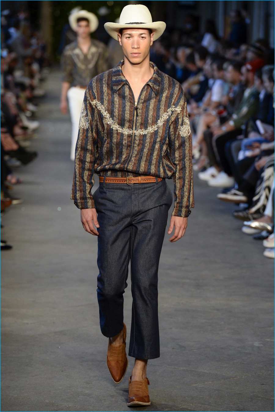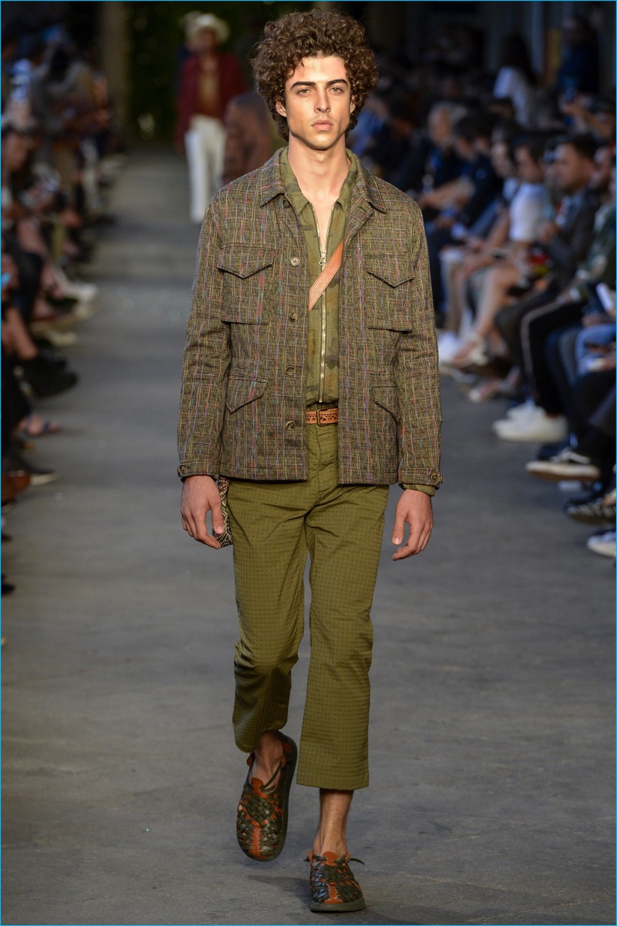 Models took to the catwalk in straw shoes and patterned shorts, finished with summer scarves, tied at the waist. Juxtaposed with long relaxed shorts, long-sleeve stripe tees and graphic button-downs, Missoni also introduced its take on the South American cowboy. The season was closed out with straight-cut trousers and a fresh spin on the western shirt.