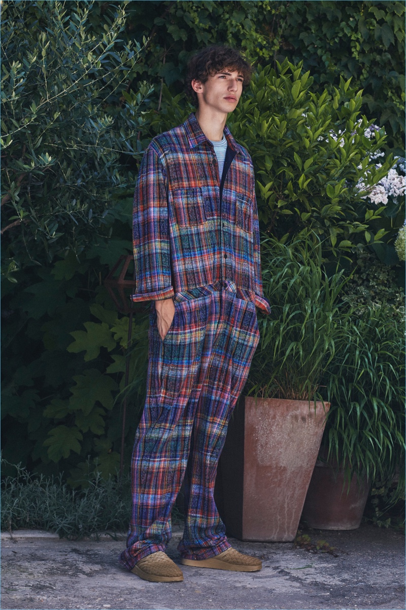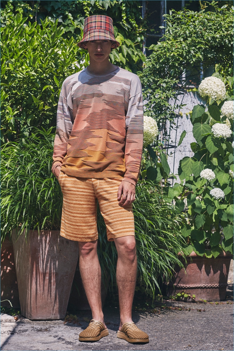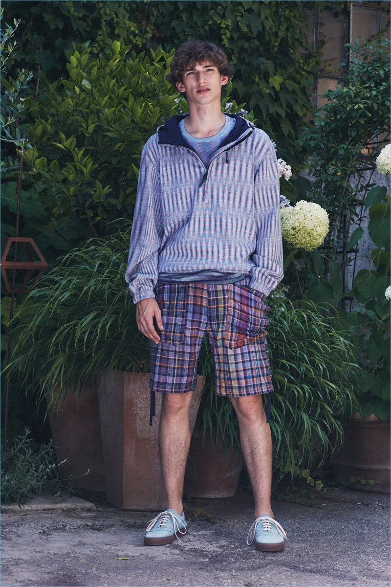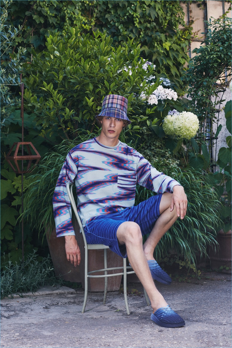 Here, Missoni’s graphic prints create a dreamlike vibe with a mix of lavender, indigo, cherry blossom, periwinkle, military green, and more. In addition to a wardrobe, complete with must-have polos, check trousers, and lightweight sweaters, Missoni continues its collaboration with Malibu Sandals and milliner Larose.