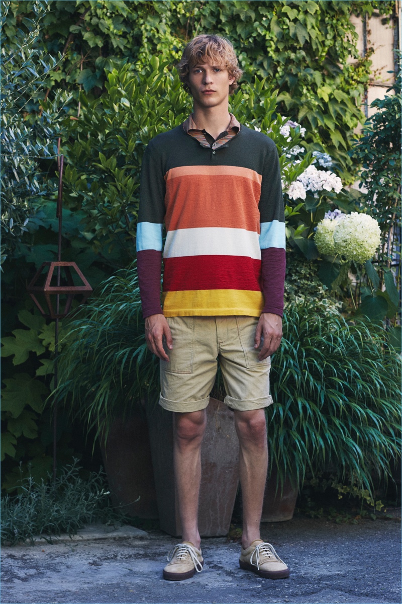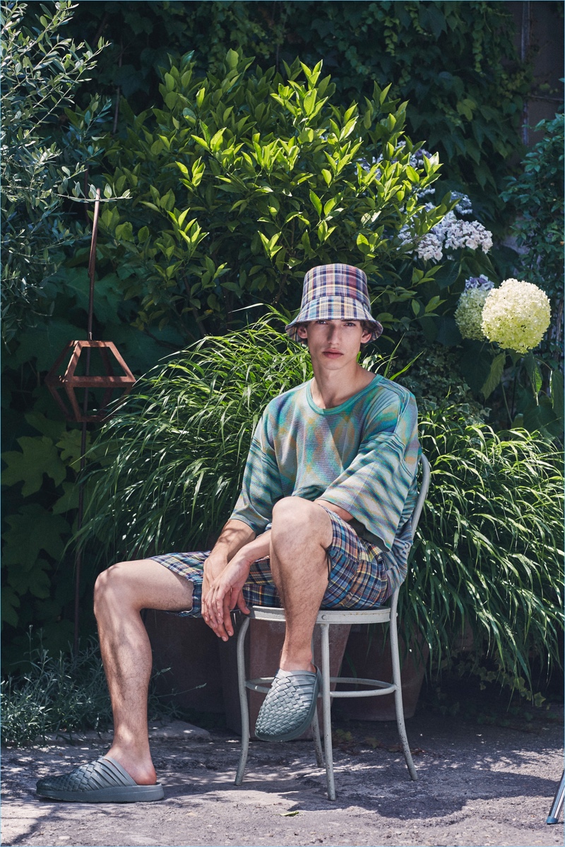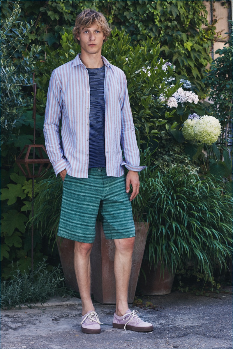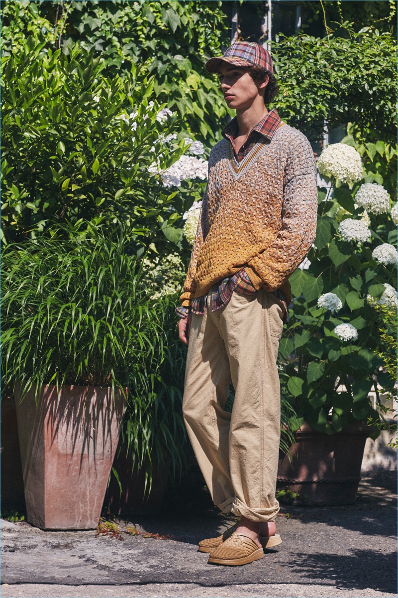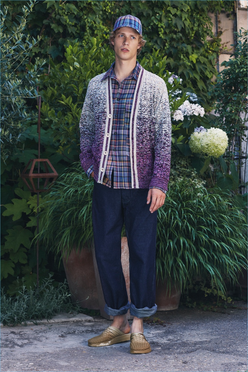 Here, Missoni’s graphic prints create a dreamlike vibe with a mix of lavender, indigo, cherry blossom, periwinkle, military green, and more. In addition to a wardrobe, complete with must-have polos, check trousers, and lightweight sweaters, Missoni continues its collaboration with Malibu Sandals and milliner Larose.