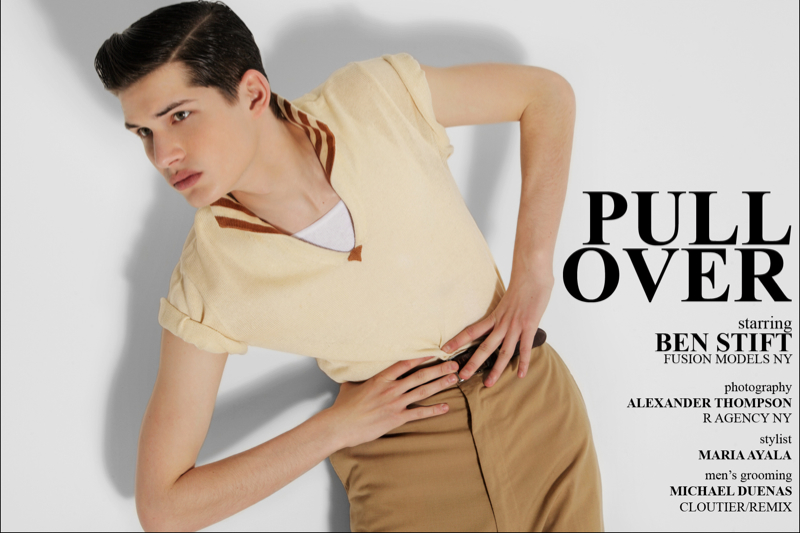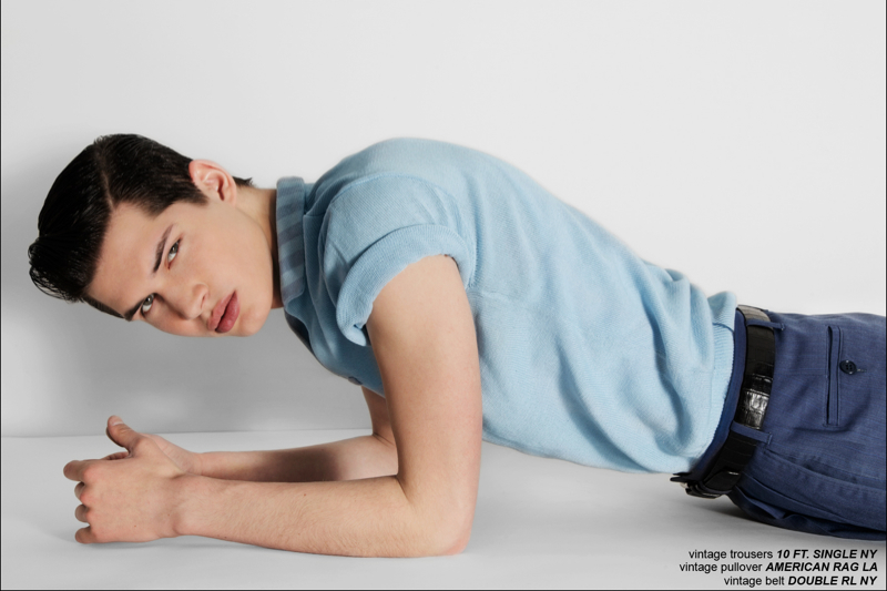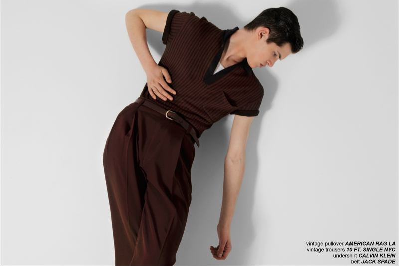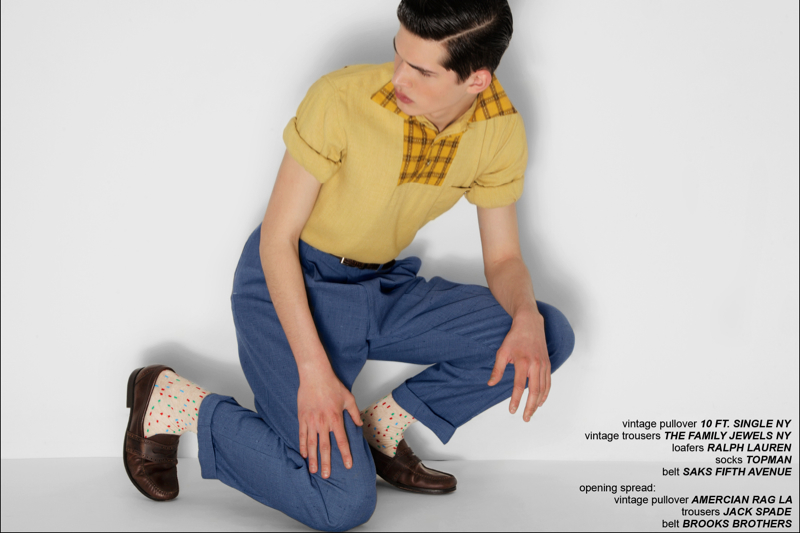 Pullover–Photographed by Alexander Thompson, Fusion model Ben Stift took part in a retro inspired photo shoot for Ponyboy, which was styled by Maria Ayala. Vintage knit pullovers with short-sleeved rolled sleeves dominate the editorial layout Pullover, from powder blues to mustard knits. Vintage pleated trousers, modern loafers, and argyle socks complete the retro inspired outfits revealed in the layout, and Stift’s youthful look and slicked hair fit perfectly with the overall retro and clean vibe.
