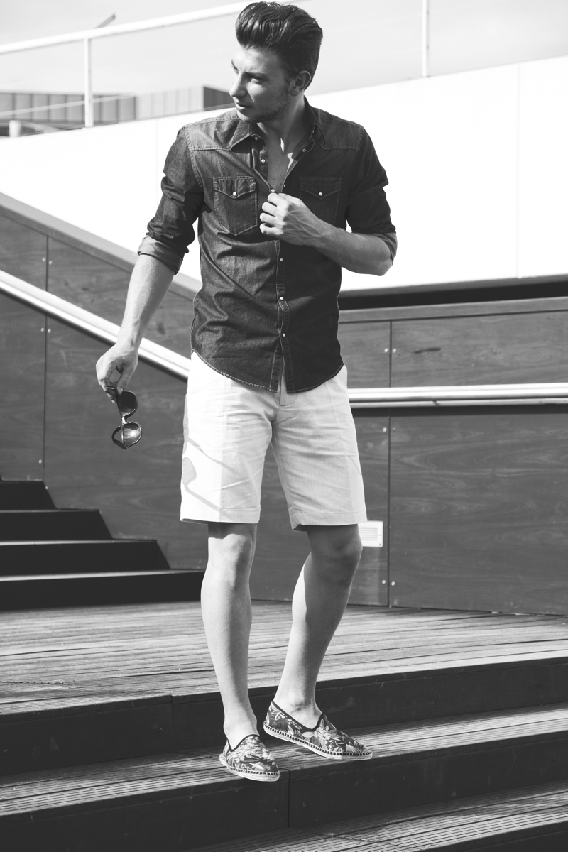 Relaxed Summer–Shooting in Portugal, model Fábio Coentrão is photographer Ion Mardare’s latest subject as he poses for relaxed images that capture an easy summer day in the city. Modeling smart styles for a comfortable wardrobe that is sensible, Fábio is captured in shorts, slip-ons, polo shirts, tropical prints and other warm-weather essentials.