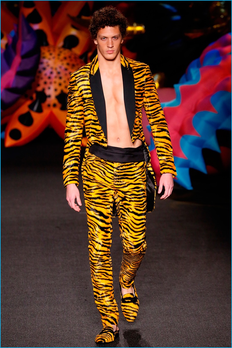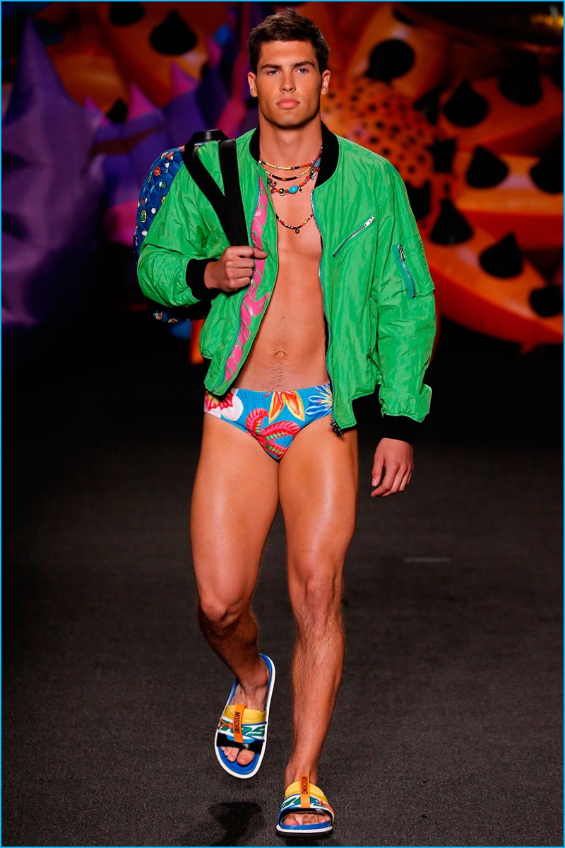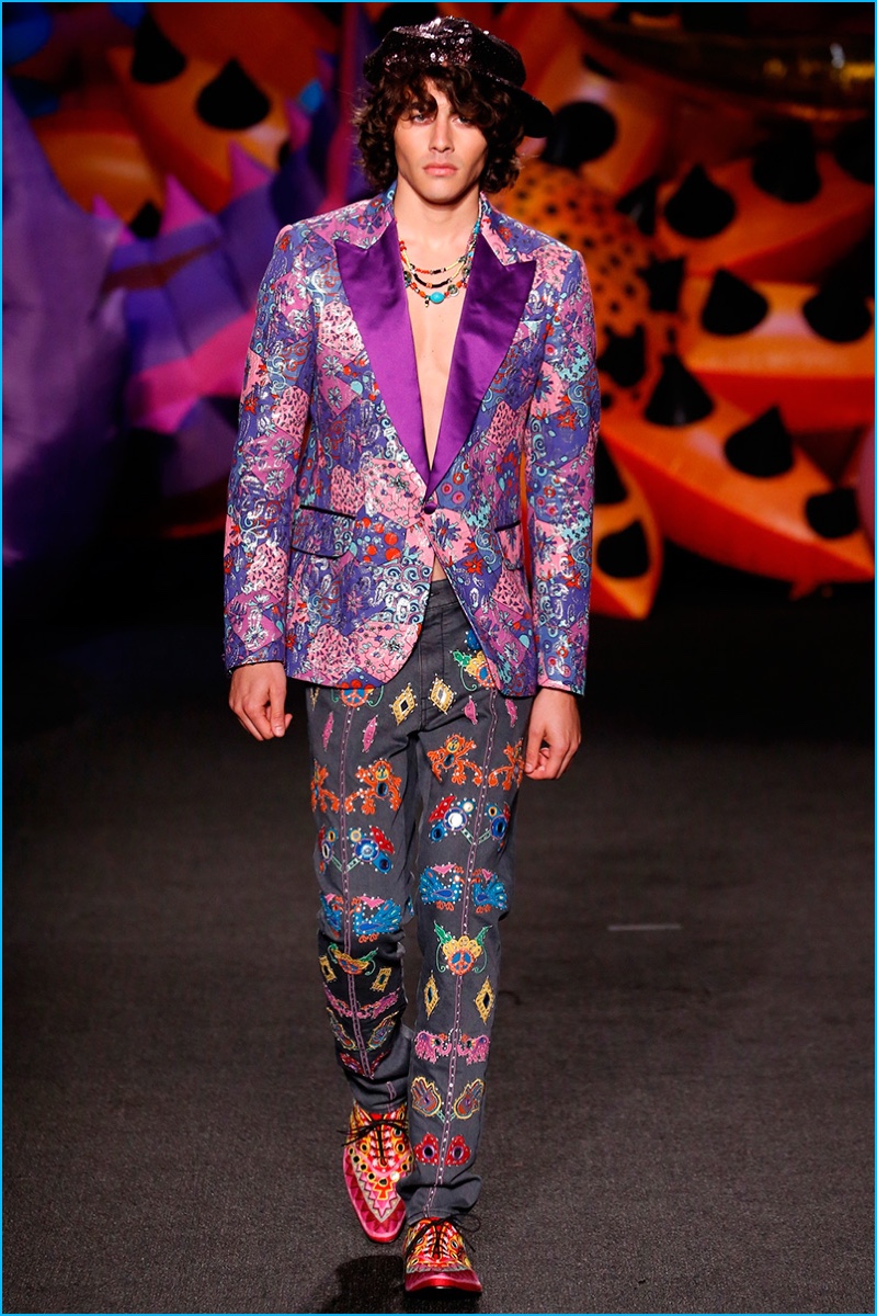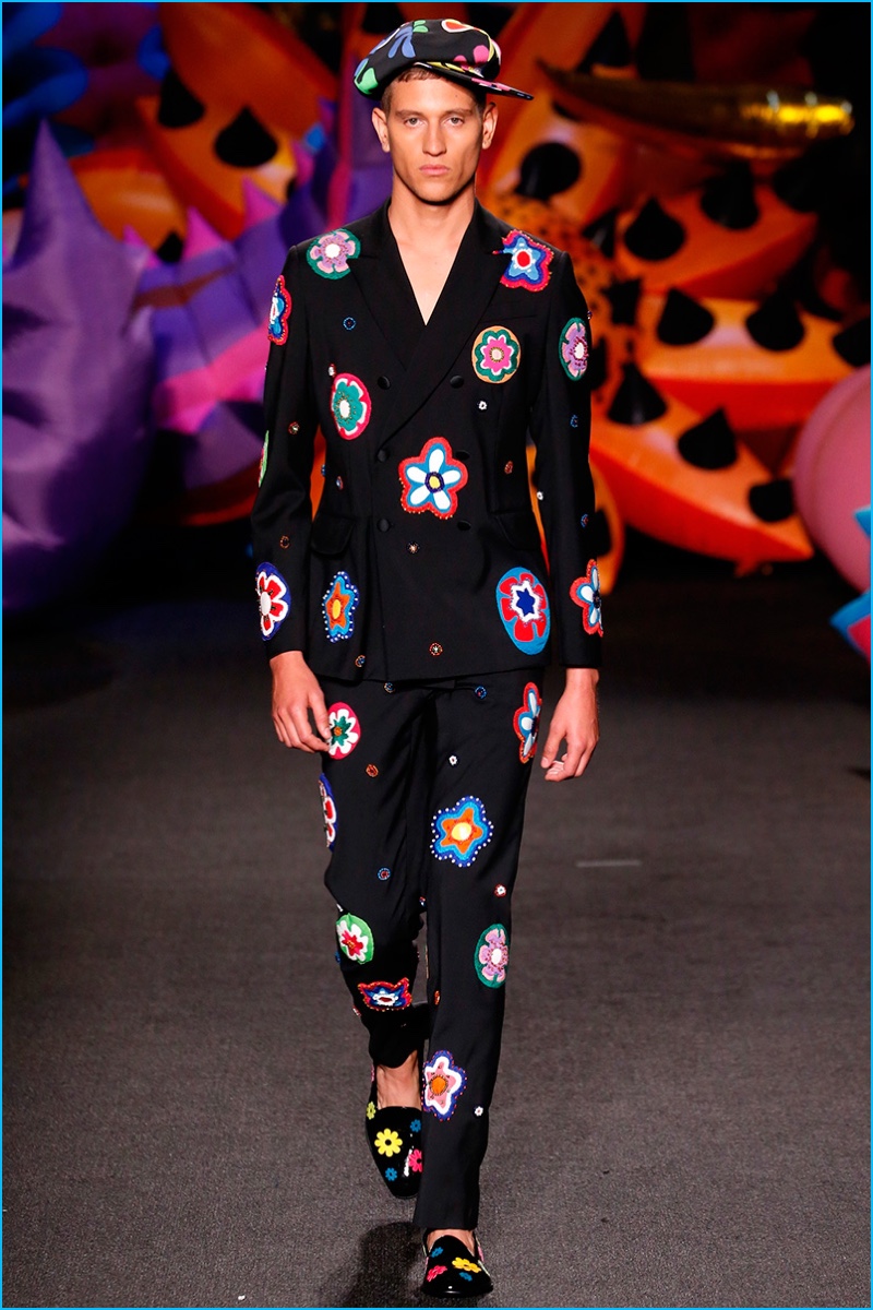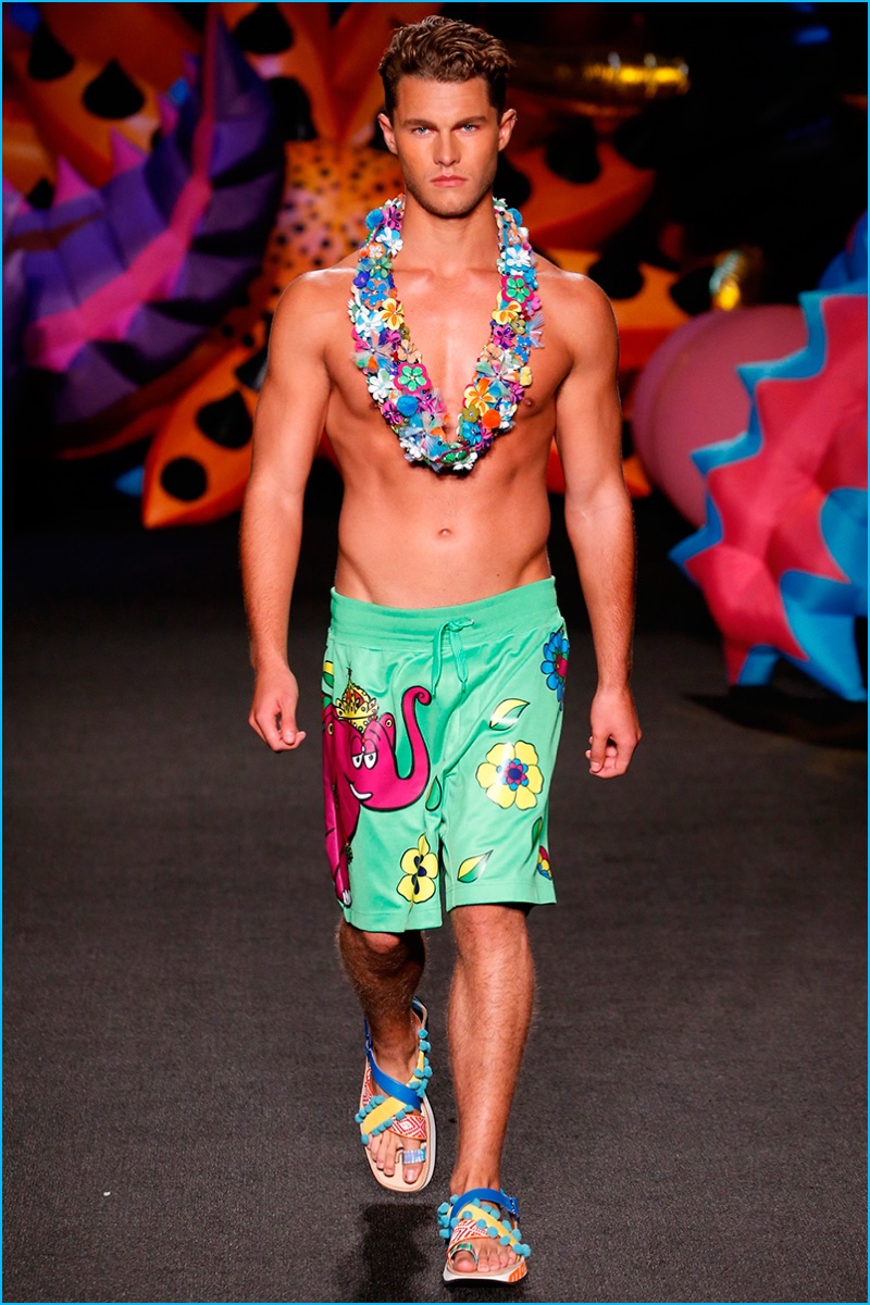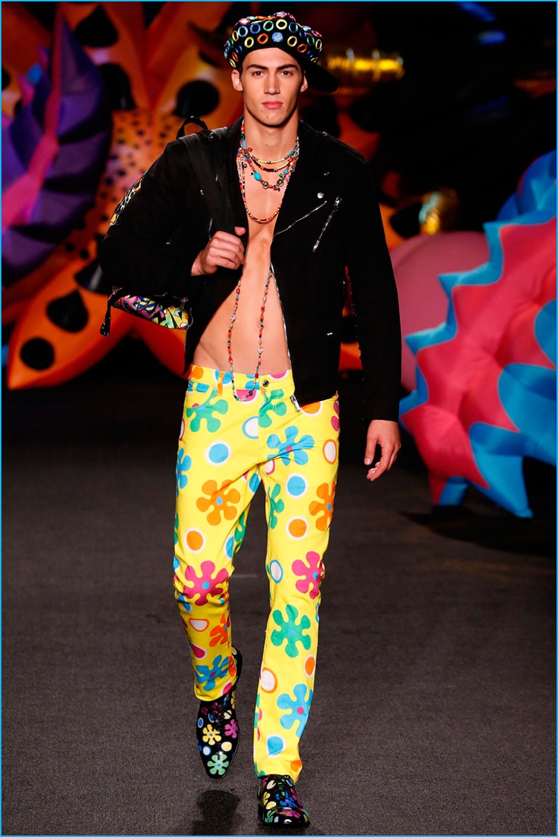 Embracing the growing trend of fashion brands taking their show on the road, Moschino unveiled its spring-summer 2017 men’s collection in Los Angeles. Designer Jeremy Scott married 90s silhouettes with 70s prints for quite the psychedelic outing. Bringing a campy flair to menswear, Scott tackled staples such as the bomber, overshirt and biker jacket, embellishing with great color and vivid patterns. Rounding out the lineup, backpacks, driving shoes, sandals and oxfords solidified Moschino’s statement making flair.