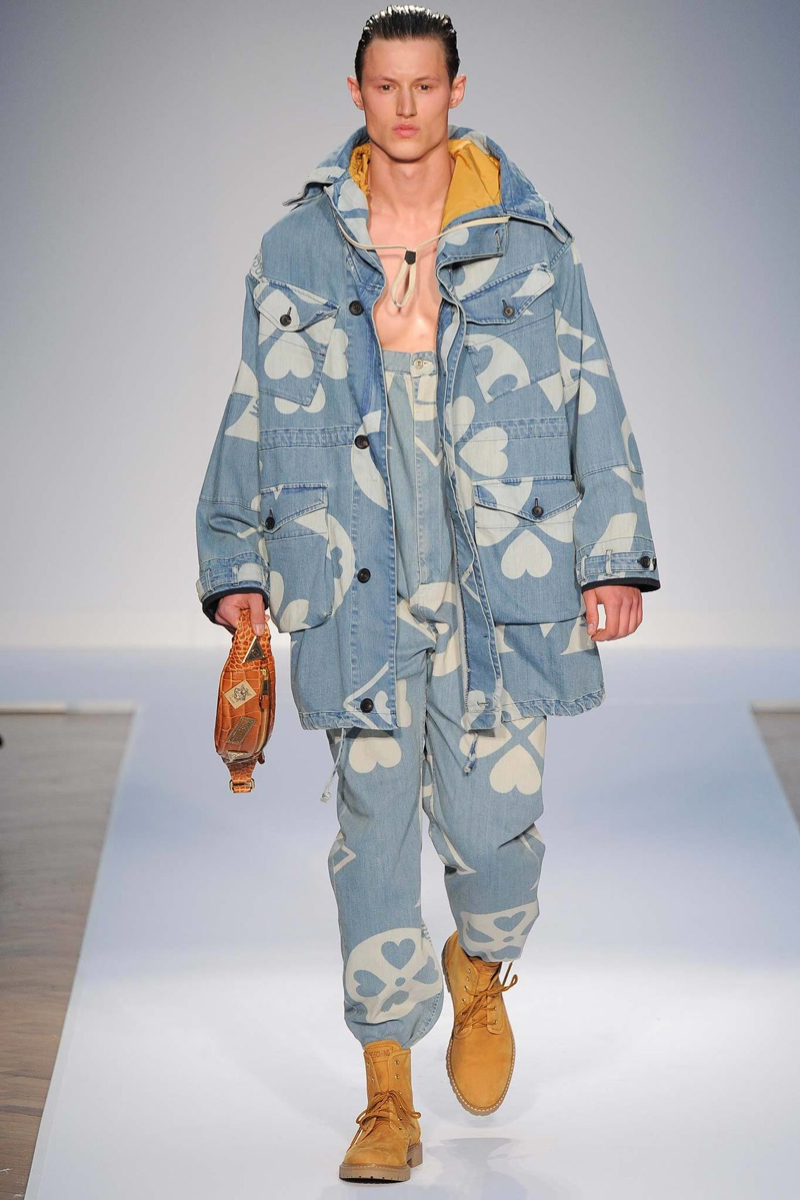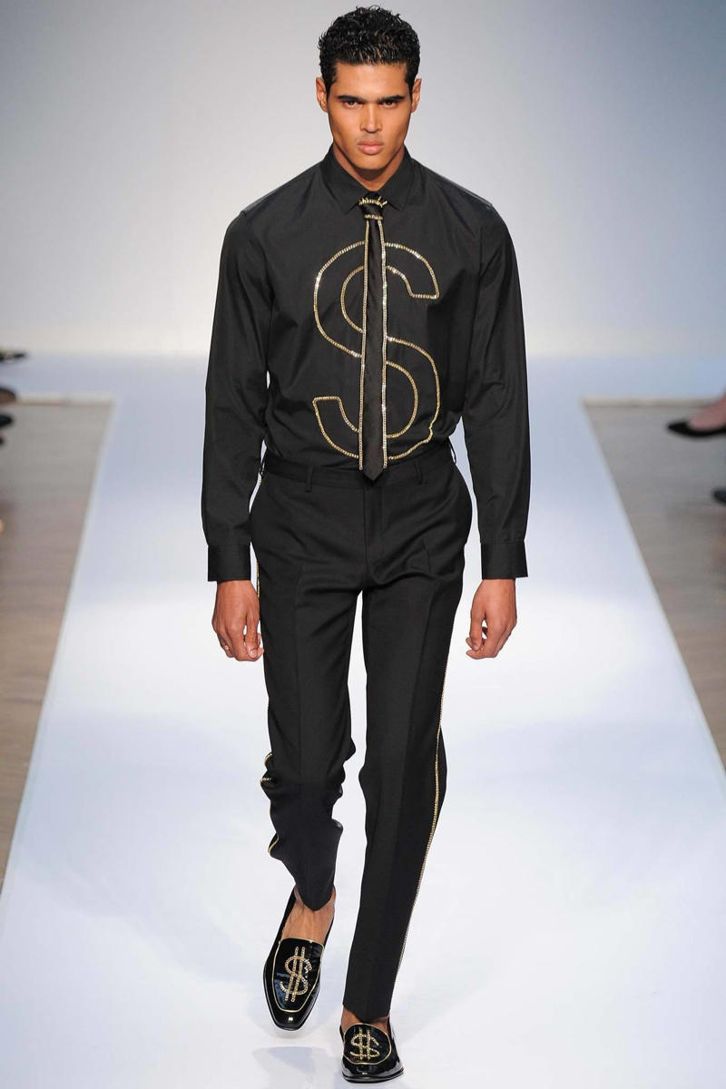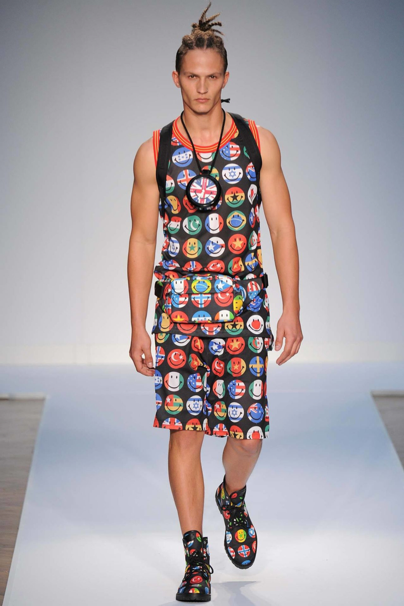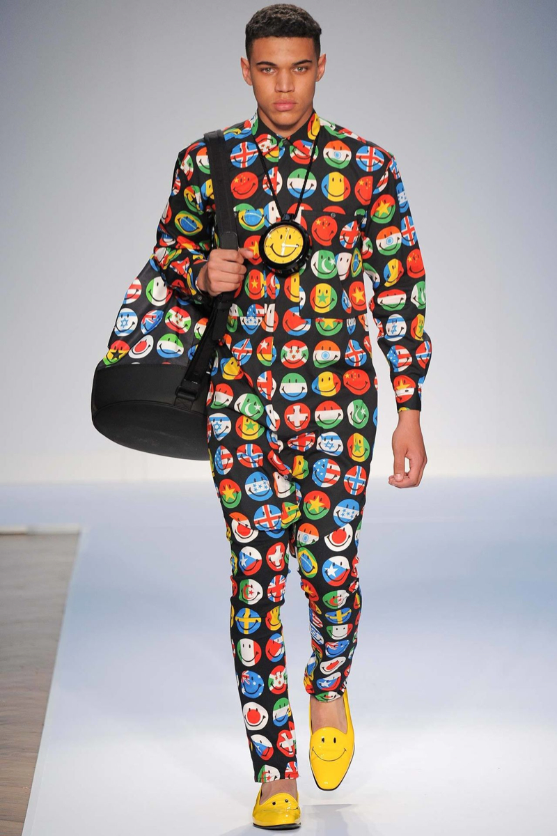 Moschino Spring/Summer 2015-Designer Jeremy Scott made his Moschino men’s debut with a big bang, channeling the fashion label’s earlier days with a sporty street wear vibe. Embracing pop art and a bold take on counterfeits, even going as far as to reinterpret Louis Vuitton’s monogram for Moschino, Scott created a lineup not for the faint of heart. One look embraced the United Kingdom, the collection’s host for show season, putting a large smiley face on the Union Jack. From overalls to logo covered sweatshirts or a suit covered in dollar signs, Moschino’s spring/summer 2015 outing was an exercise in free expression.