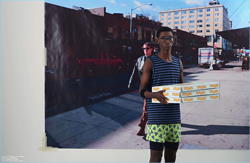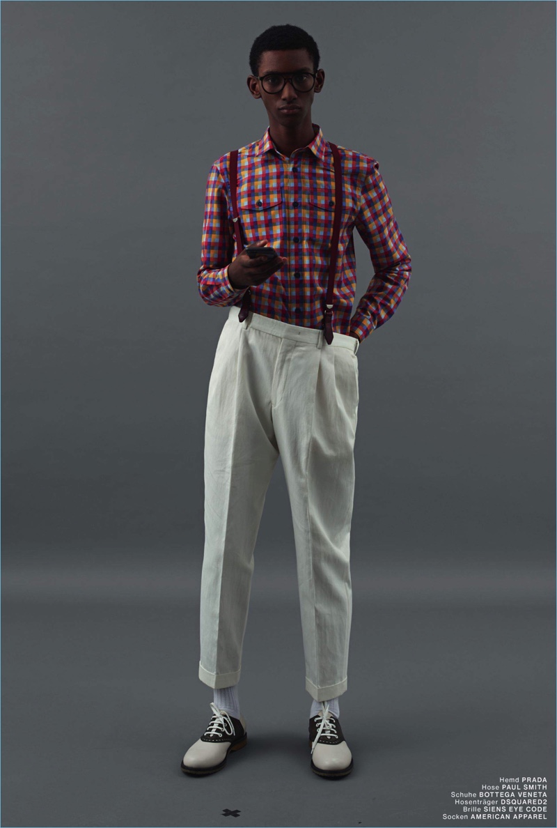 Embracing prints, Myles Dominique models a shirt and pants from Burberry. He also sports Gucci loafers and Live in Vintage sunglasses.Pin