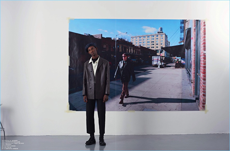 Model Myles Dominique wears a Neil Barrett jacket with a vintage t-shirt and Jil Sander shoes. Myles also models a bag and jeans from MSGM.