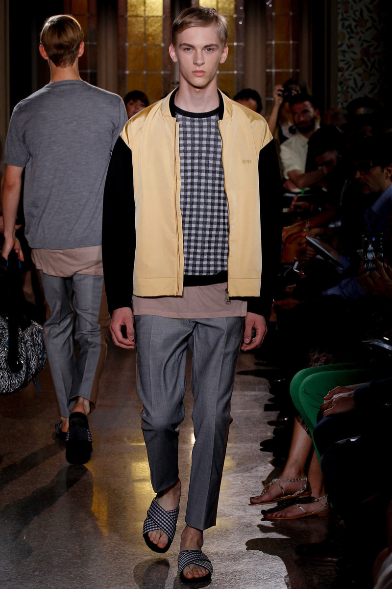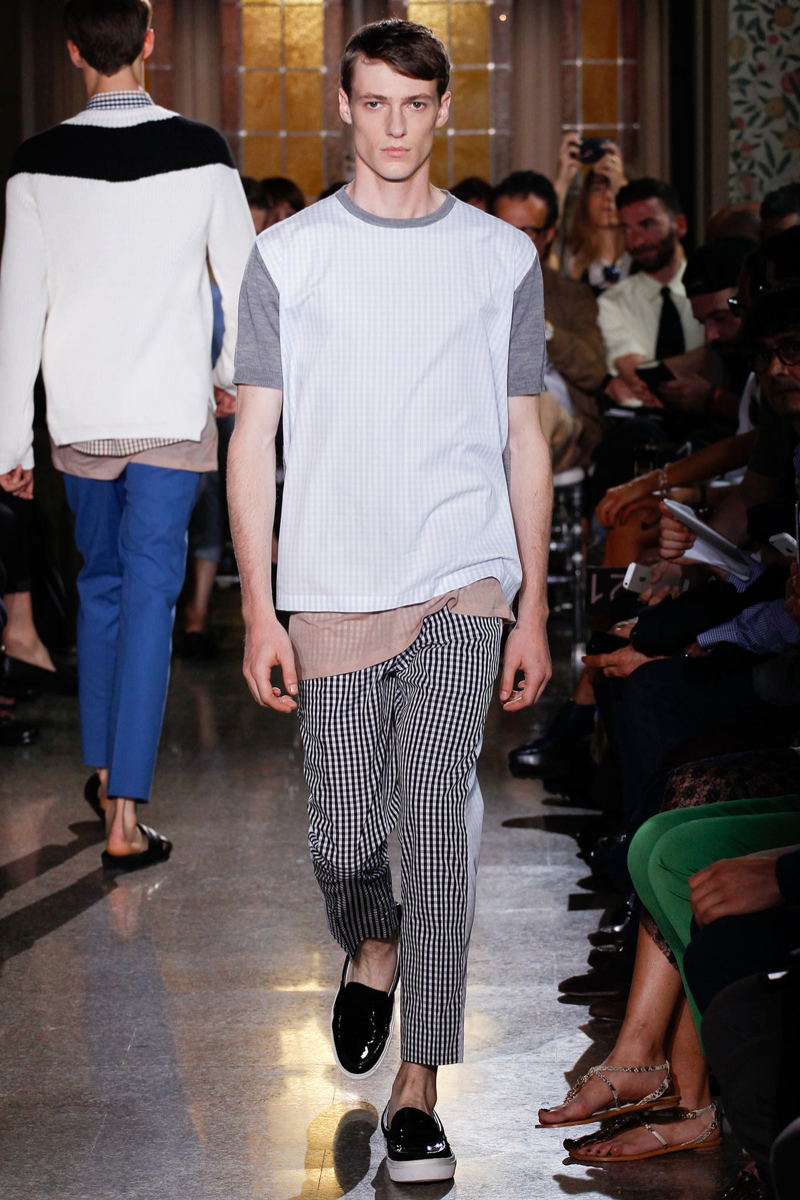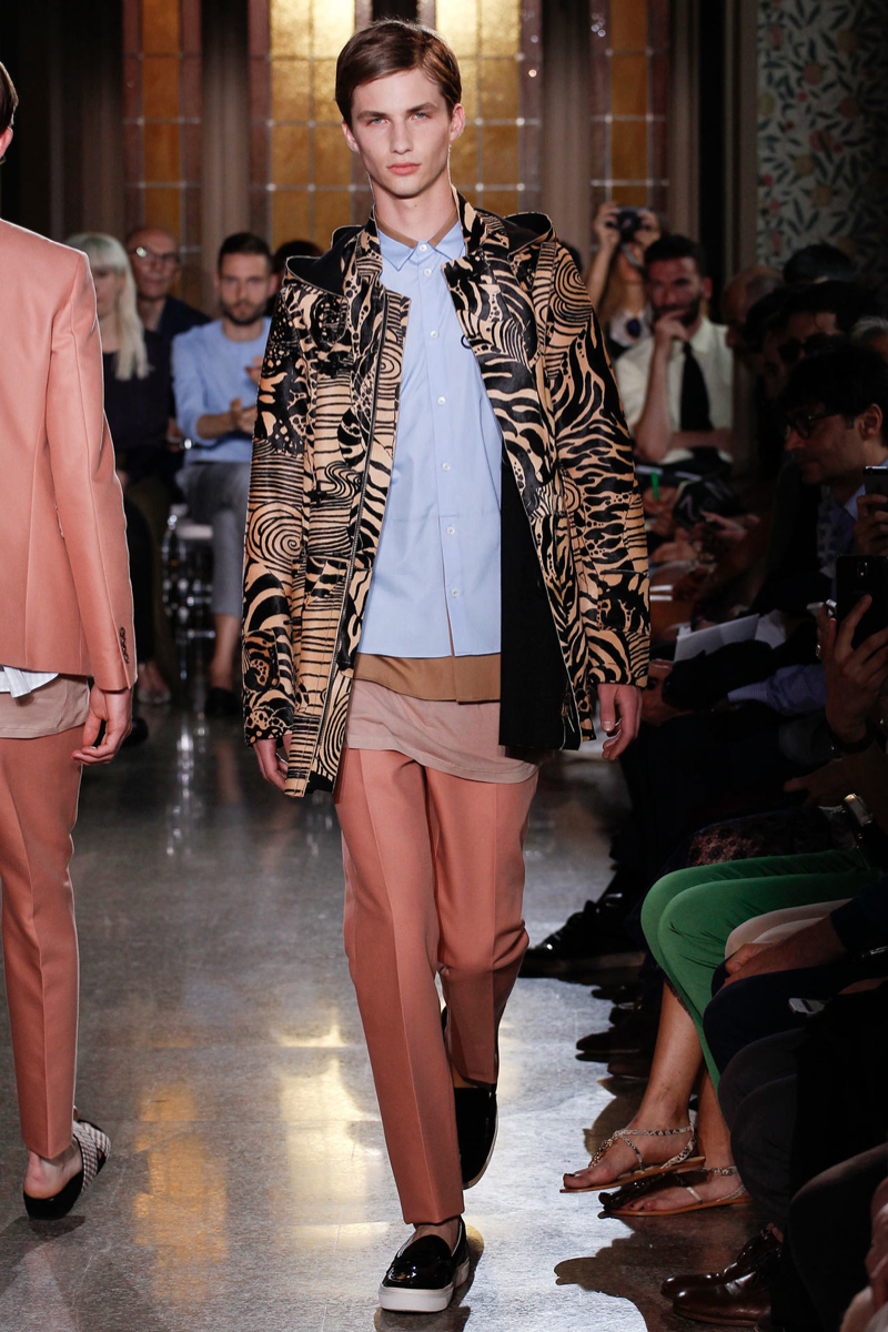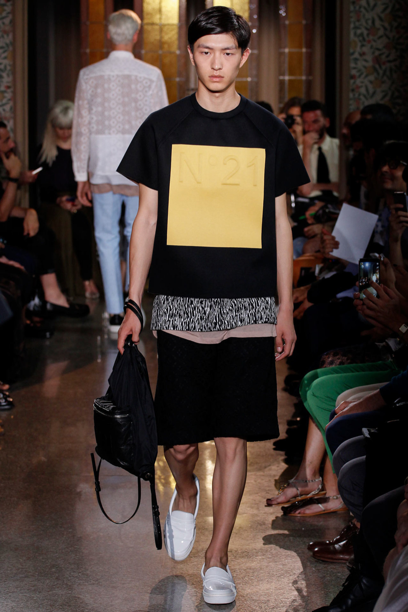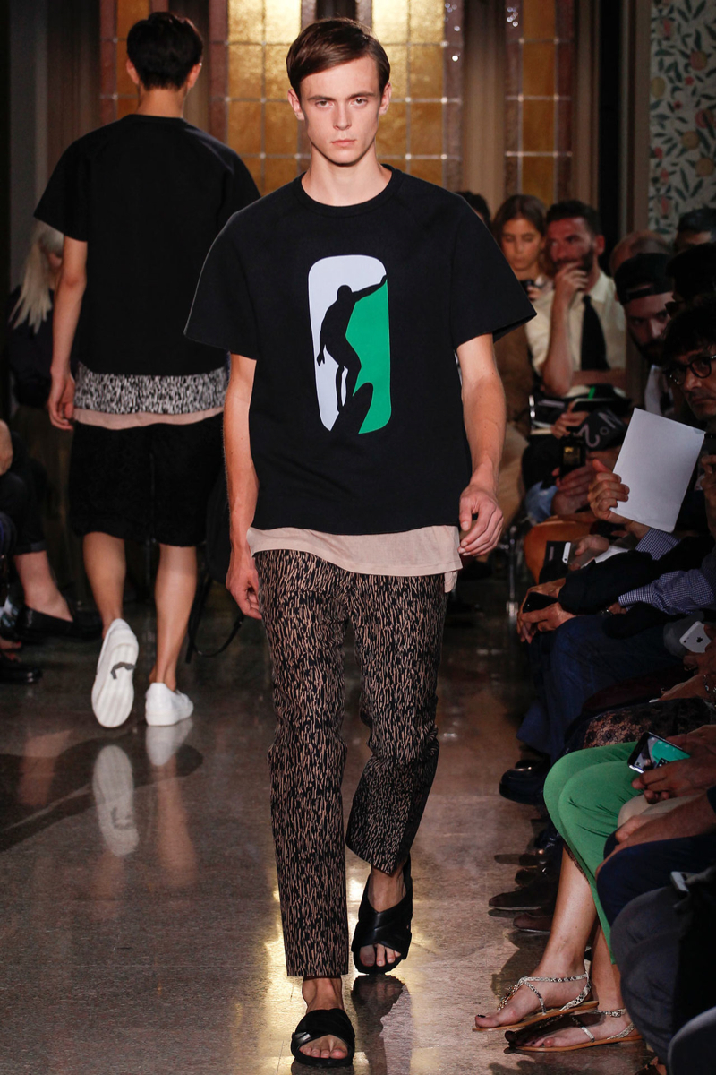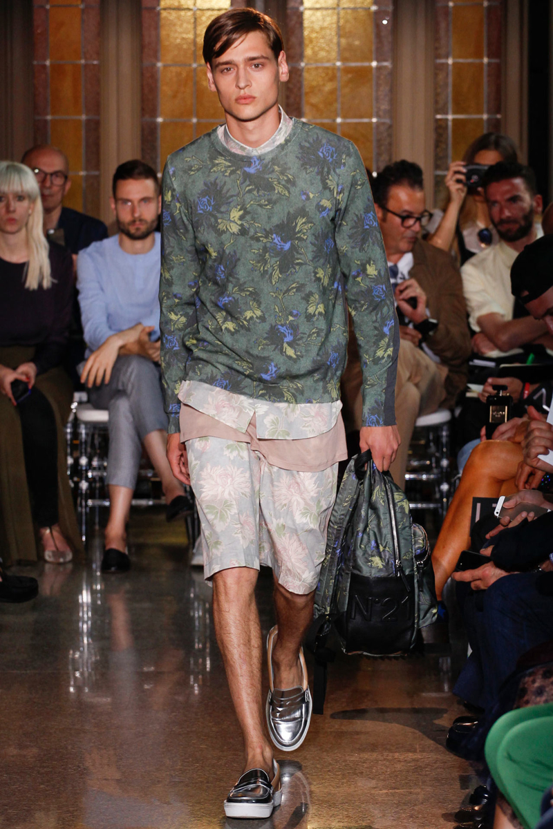N°21 Spring/Summer 2015-Making his menswear runway debut, N°21 designer Alessandro Dell’Acqua found his voice with the youthfulness of a skater. Mixing prints in different colors with varying lengths, style savvy layers came together with a fun attitude. Sweatshirts with N°21 logos were an instant must-have as well as a series of separates dressed in muted tropical prints. Add graphic t-shirts and striped knits to the mix and you have a well-rounded collection for the luxury customer that possesses a playful edge.