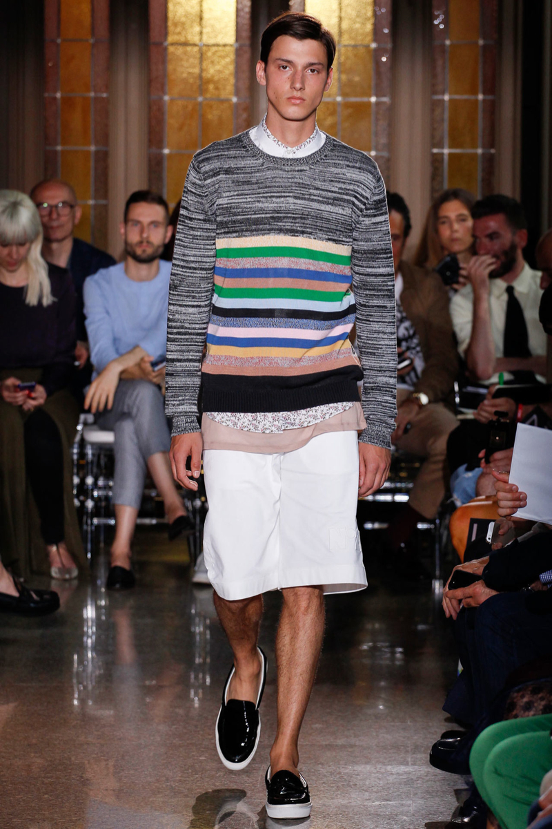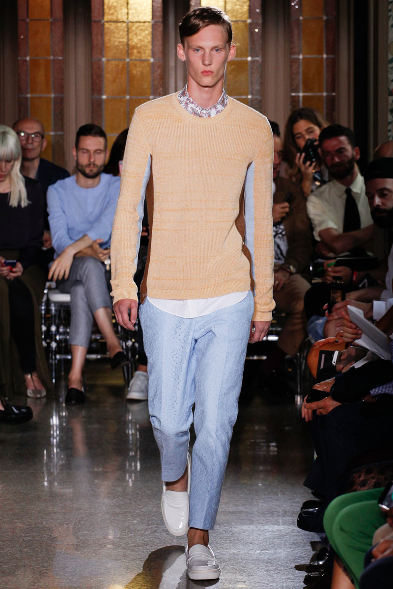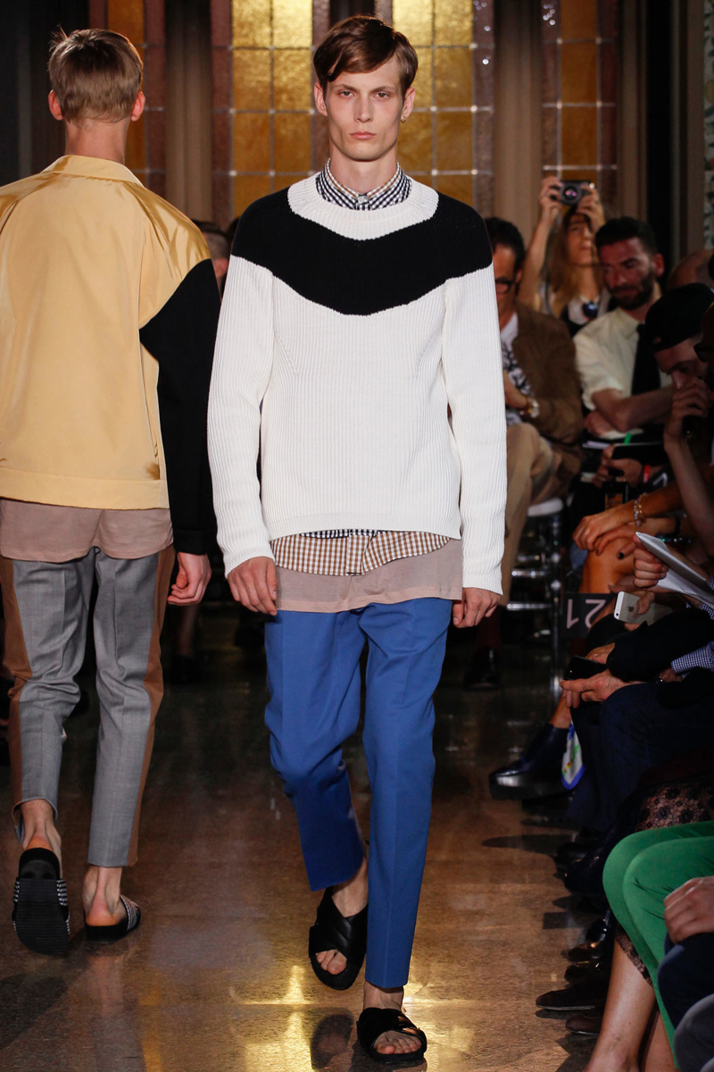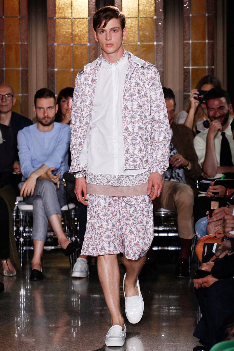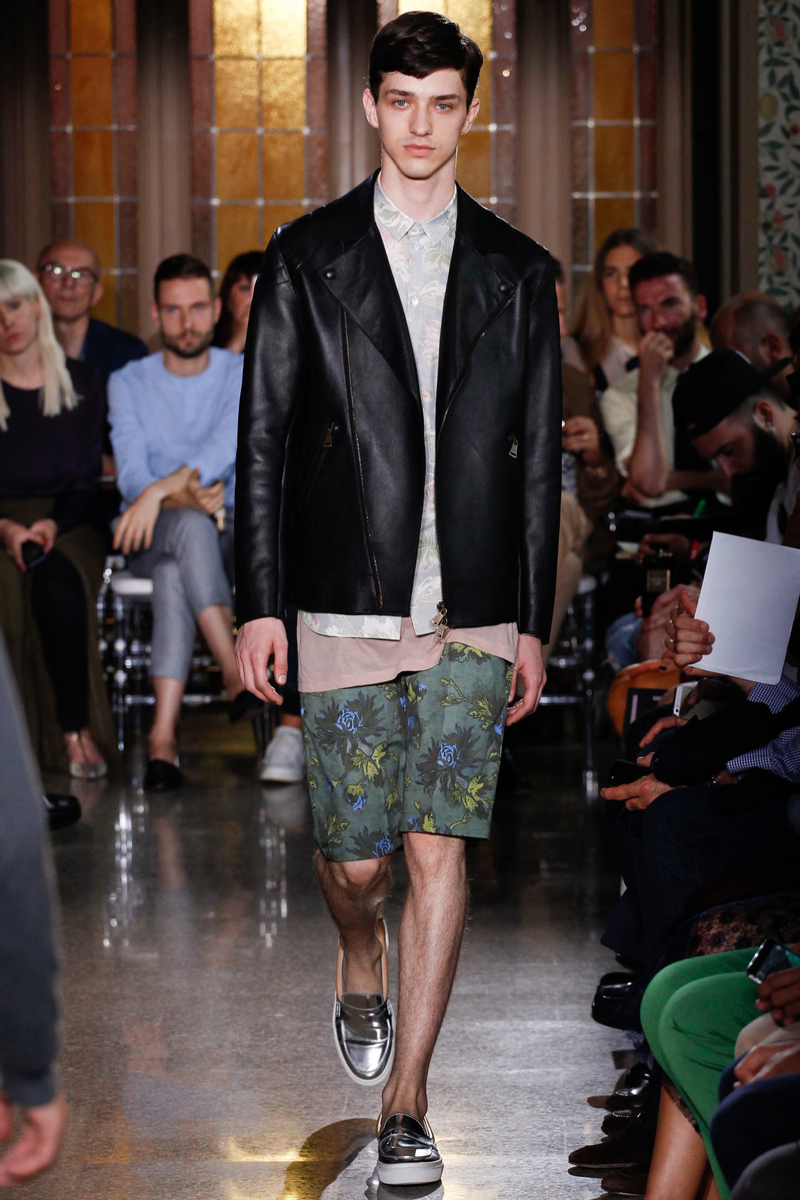 N°21 Spring/Summer 2015-Making his menswear runway debut, N°21 designer Alessandro Dell’Acqua found his voice with the youthfulness of a skater. Mixing prints in different colors with varying lengths, style savvy layers came together with a fun attitude. Sweatshirts with N°21 logos were an instant must-have as well as a series of separates dressed in muted tropical prints. Add graphic t-shirts and striped knits to the mix and you have a well-rounded collection for the luxury customer that possesses a playful edge.