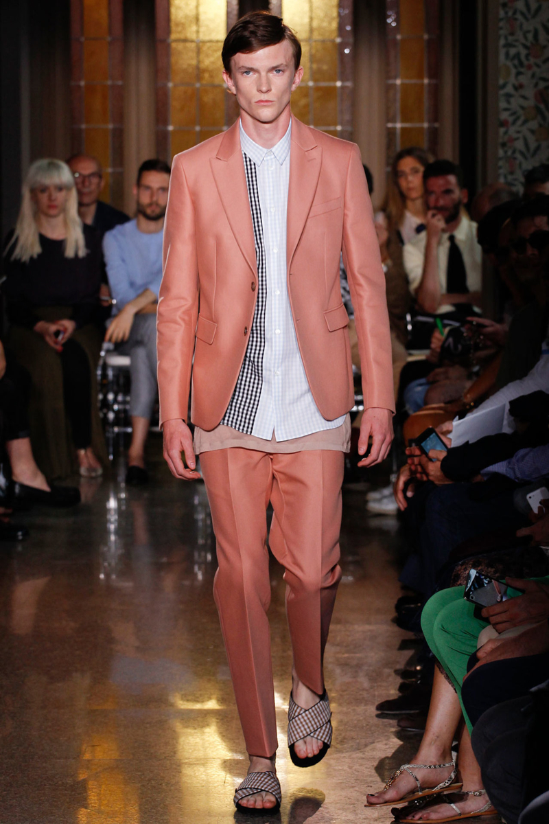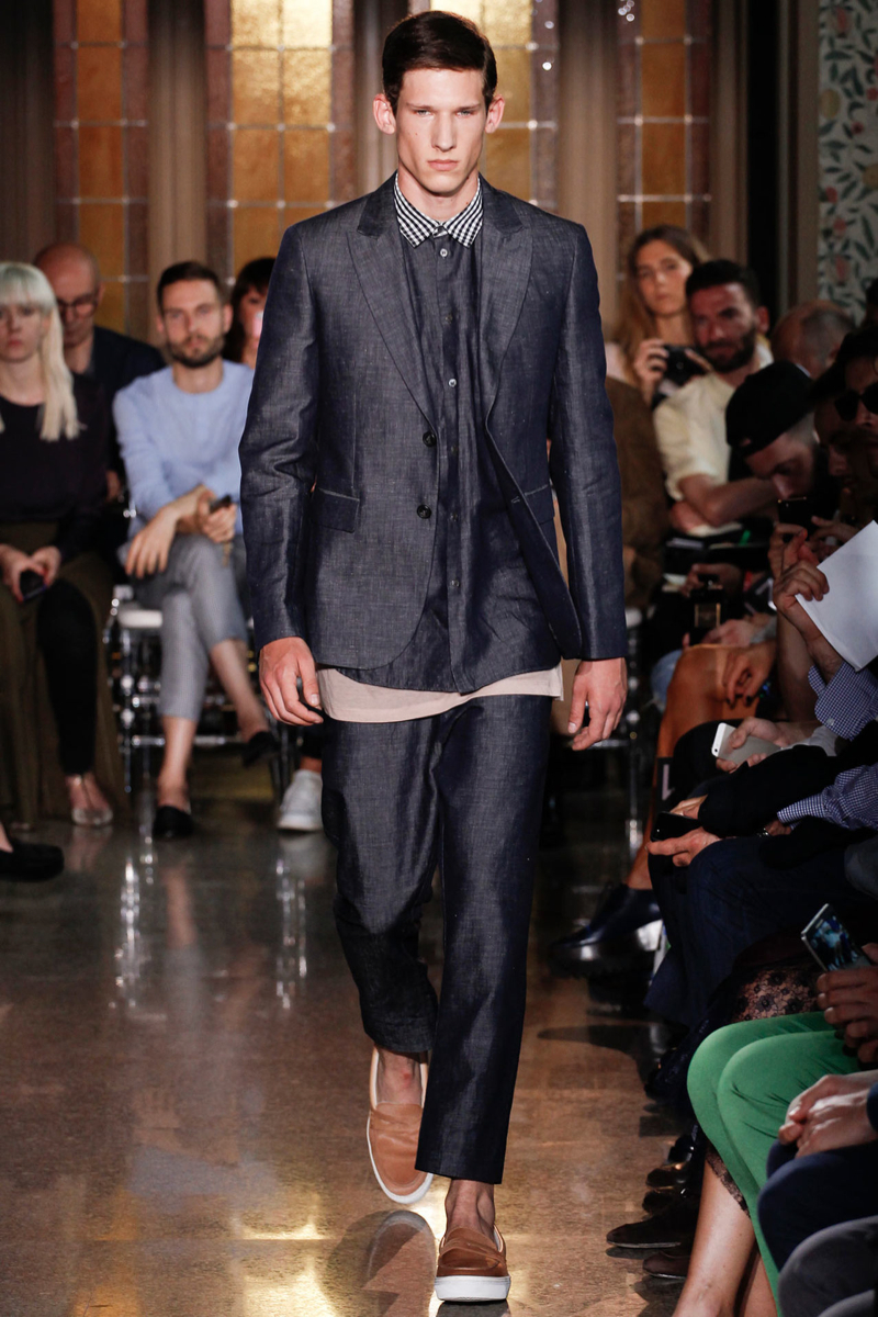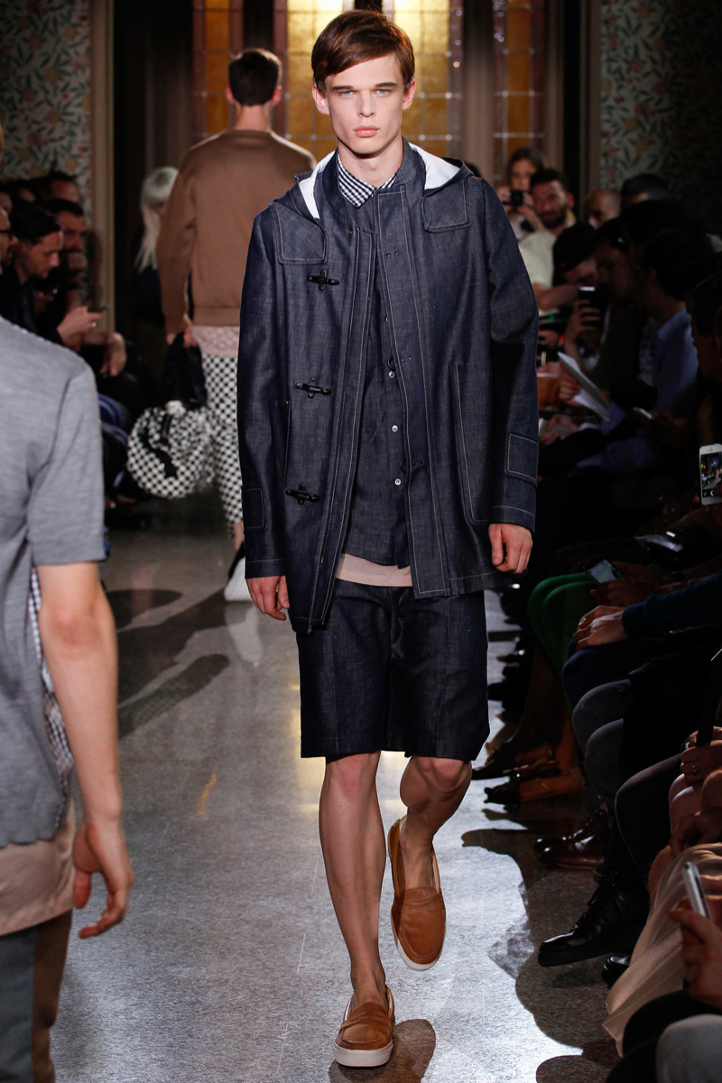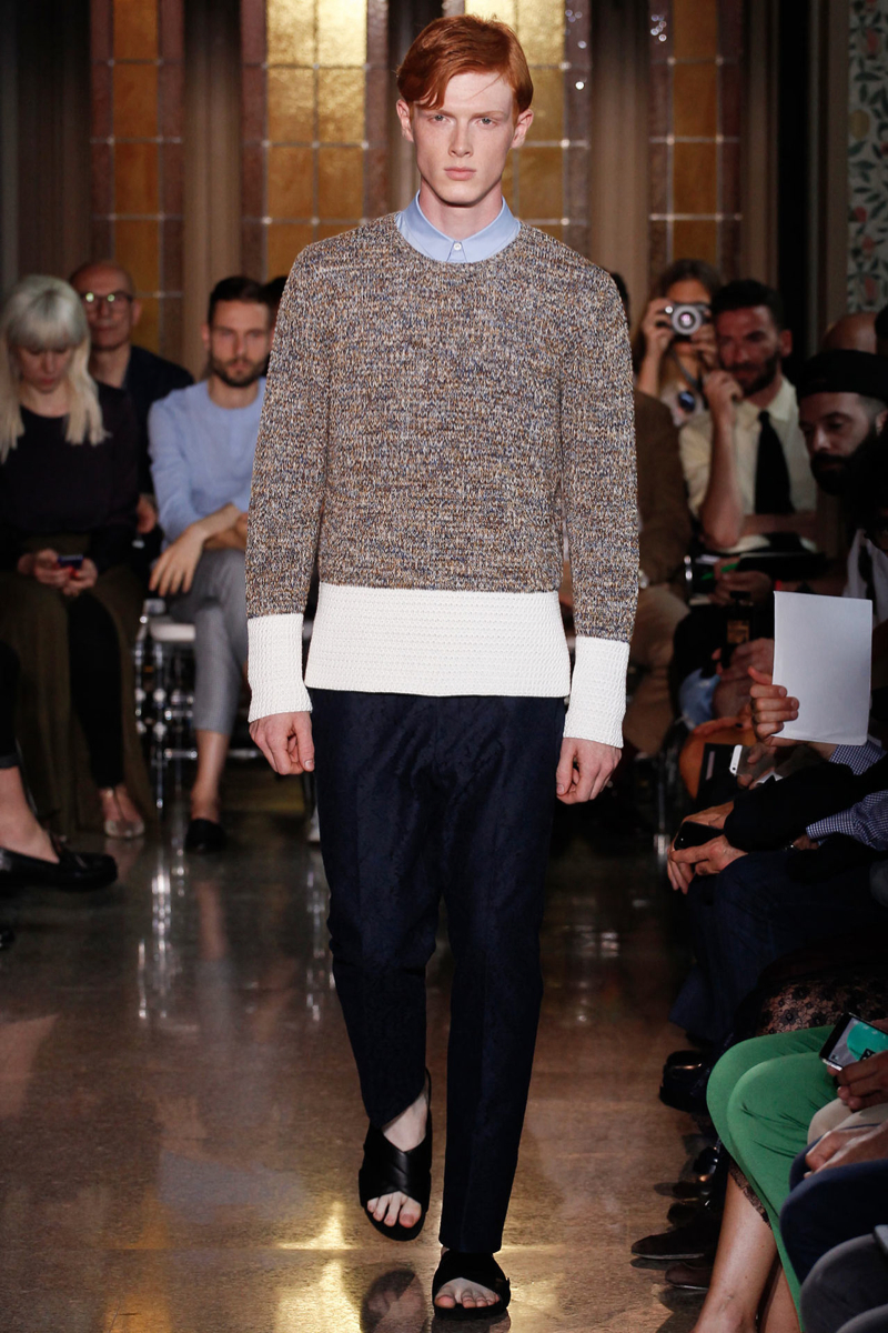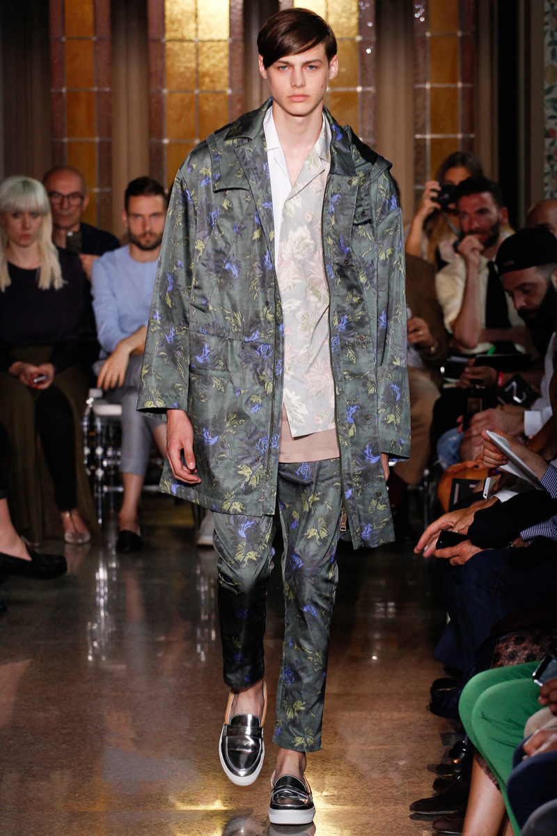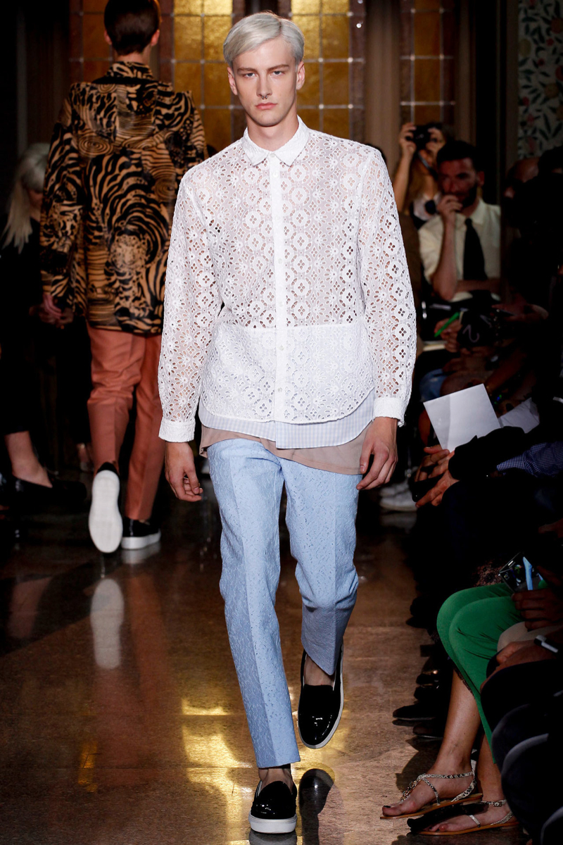 N°21 Spring/Summer 2015-Making his menswear runway debut, N°21 designer Alessandro Dell’Acqua found his voice with the youthfulness of a skater. Mixing prints in different colors with varying lengths, style savvy layers came together with a fun attitude. Sweatshirts with N°21 logos were an instant must-have as well as a series of separates dressed in muted tropical prints. Add graphic t-shirts and striped knits to the mix and you have a well-rounded collection for the luxury customer that possesses a playful edge.