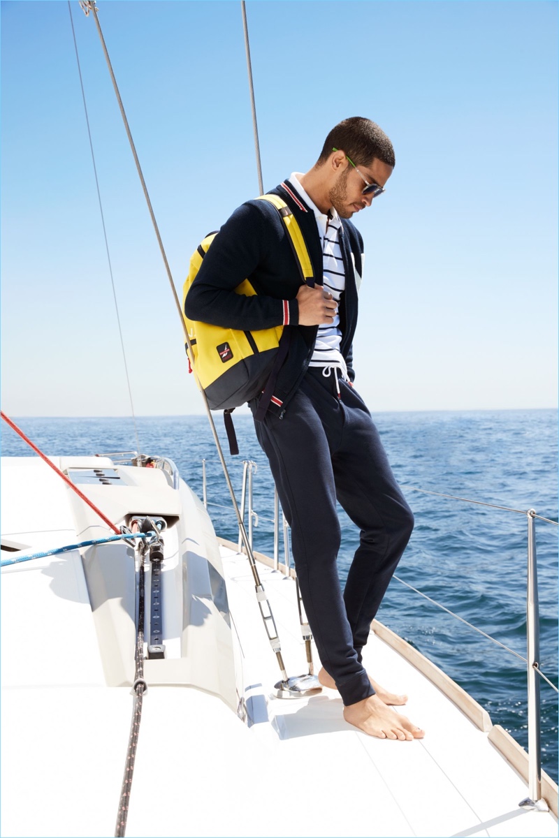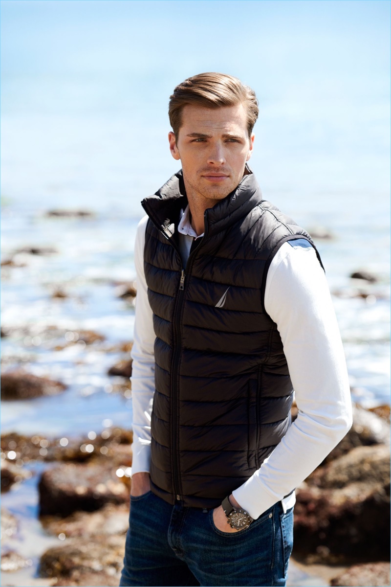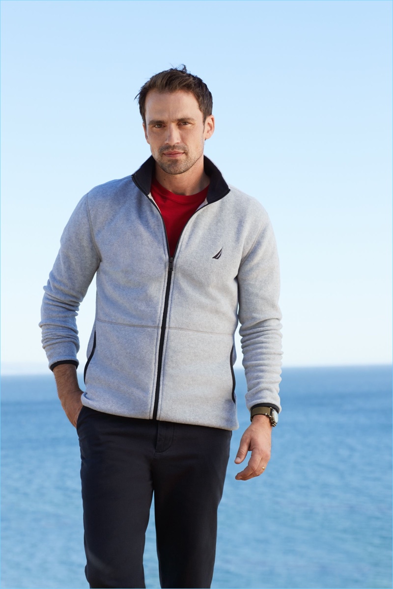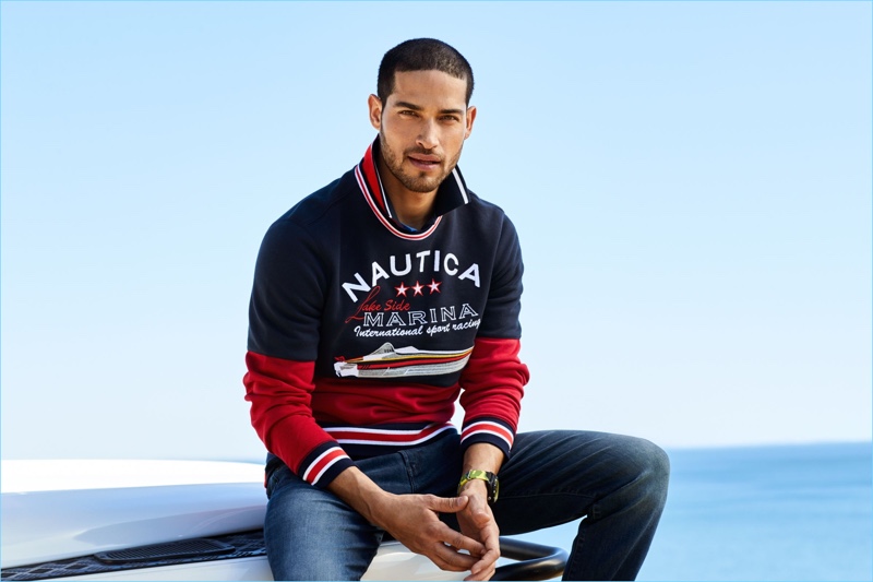 Embracing a sporty cool, Edward Wilding fronts Nautica’s fall-winter 2018 outing.
