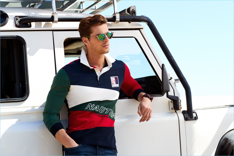 British model Edward Wilding dons sunglasses and a watch for Nautica’s fall-winter 2018 campaign.