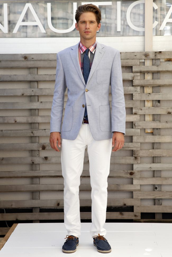 Seaside Coloring–Bold color with a slightly relaxed fit dictated the latest offering from Nautica. On the backs of models like Chad White, Cory Bond and Garrett Neff, the nautical-based brand offered up polos, board shorts and more than its fair share of sharp tailored blazers. Chinos received a shot of color as did jackets, coats and a selection of carryalls that were presented as accessories. With an eye towards the unpredictability of weather as of late, the collection also contained a cowl necked sweater as well as a few heavier coats, ready for any predicament.