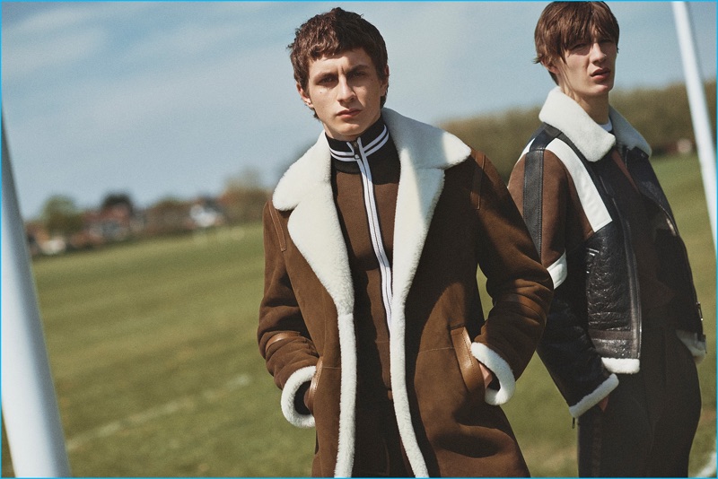 English fashion designer Neil Barrett returns home to the United Kingdom for his fall-winter 2016 campaign. Set in London, the advertisement features models Henry Kitcher and Finnlay Davis. The pair take to an open field, posing for images by photographer Scott Trindle. Barrett’s graphic and sporty flair for design takes centerstage for the outing. Stylist Tony Irvine outfits Henry and Finnlay in track jackets, skinny fit sweaters, eagle adorned sweatshirts and shearling outerwear.