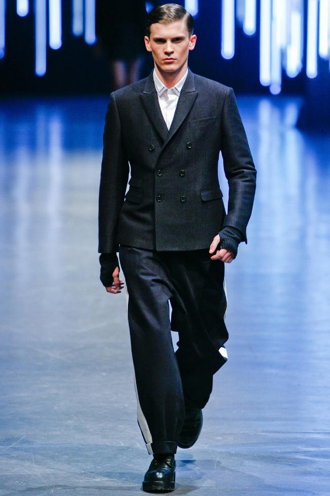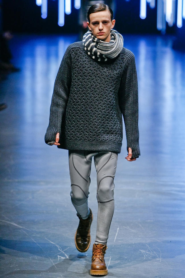 Activewear takes center stage for Neil Barrett’s fall 2011 collection. Telling a black, white and gray story with textured lines and graphic prints, Barrett sent his men down the runway in clunky boots and technical fabrics. Playfully approaching this season’s silhouette, the collection boasted chunky knits paired with a mix of wide-cut trousers and unforgiving slim-fitted pants. From intersecting stripes and textured panels to subtle gradients, Neil Barrett’s man traversed the world of athletics and fashion for an interesting fall outing to say the least.