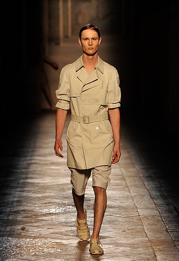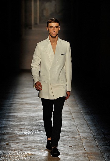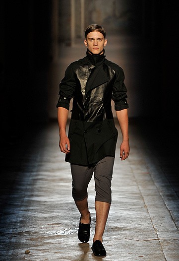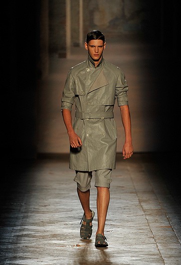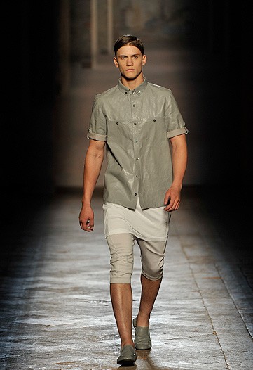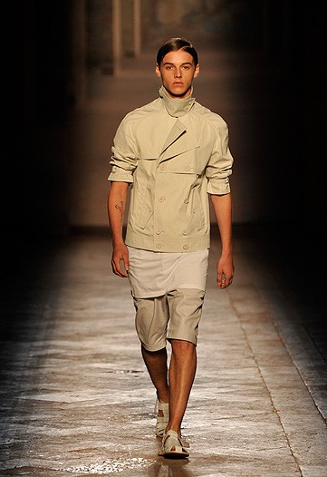In an unexpected fashion, Neil Barrett pleases with his neutral-based spring collection of smart chic leather and well-crafted layered proportions. Set in a broad and boxy-set collection, below the knee shorts are a vision paired with the light-weight mackintosh that has been given a modern update with the stealthy use of vacuum-sealed leather. Color blocking accomplished at acute angles gives the commonly used applique a fresh look, while thin elongated shirts perfect for layering are a definite season must-have. Barrett’s use of a dark color palette perfectly frames his brocade prints in an interesting masculine fashion that is juxtaposed with an edgy elegance. All in all, Barrett’s distinct vision for the upcoming season is sure to translate into expanded editorial coverage and a well-deserved increase in demand.