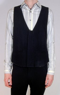 I’ve always been a fan of Opening Ceremony. Their clothes always have unique details that add character to any wardrobe. Blackbird just received the above vest. I’m crazy about the cut. In a sea of cookie cutter vests, this new shape is welcomed with open arms. And it doesn’t hurt that it is made out of wool/cashmere. Check out the official Blackbird blog for more information.