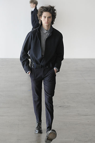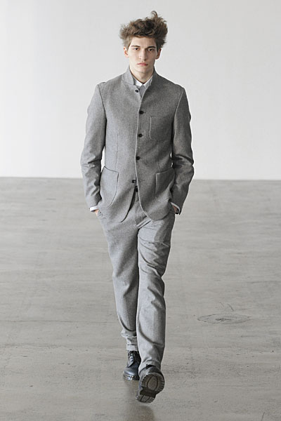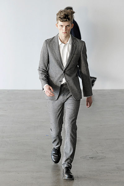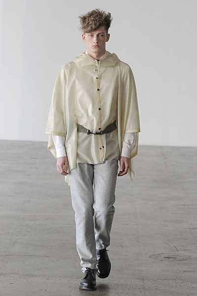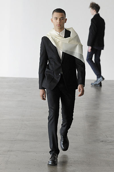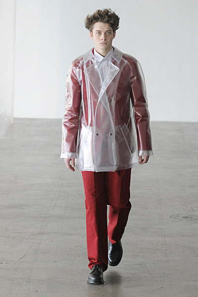 Opting for a presentation this season, but still giving his audience the runway experience, Patrik Ervell sent his models into a flurry as they were put on constant rotation making their way through a maze-like setup–dissected by the suspended pieces of translucent fabric that in fact mirrored the collection’s constrained playfulness. Fitted and strong on structure, Ervell’s minimalist tendencies were fused with the unexpected gracefulness of soft moving latex rubber and transparent vinyl. The product of a finely executed imagination, Ervell’s simple eccentricities blended harmoniously with with neutral based garments, crafted from wool and tweed. Set to the frantic music of Terry Riley, Ervell served a beautiful collection of controlled insanity–monochromatic numbers, meticulous tailoring and a uniform fit that felt fresh yet organic.
