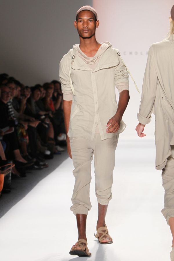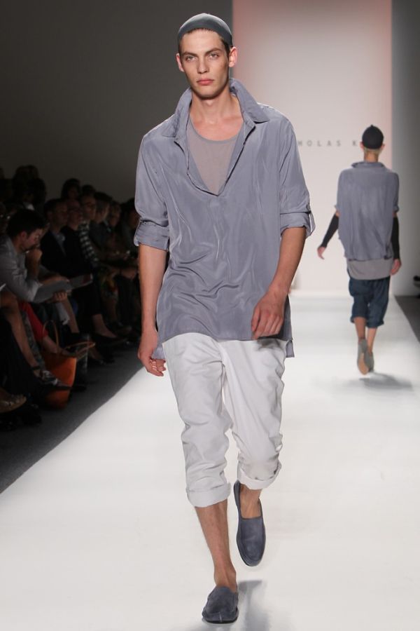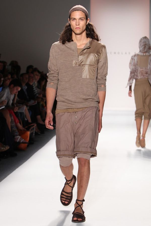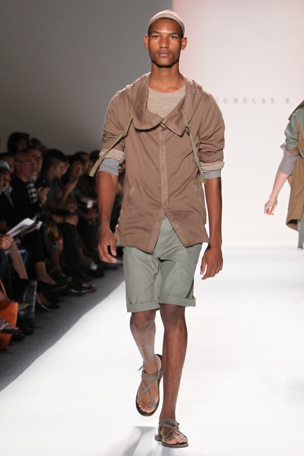 Light Fashion–Playing it low-key in terms of color, the latest collection from New York-based label Nicholas K tapped into soft hues of camel, gray and blue for the spring/summer 2013 season. Adding leather and color blocking to their signature layers, a light wardrobe to unpack was revealed. While shorts, cuffed or cut straight made their appearance, semi-relaxed knitwear boasted a charming lived-in quality. A strong point of vision as usual, the brand’s outerwear lineup furnished functional parkas, lightweight sports jackets and transitional pieces for a smart selection moving forth.