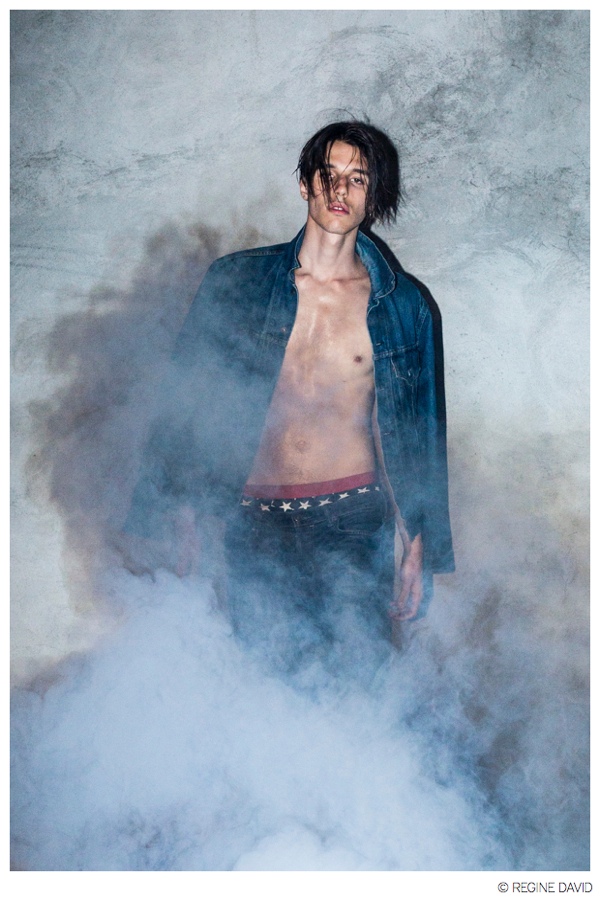 Denim Now-ADAM model Nick Hadad connects with photographer Regine David, modeling perhaps one of the most accessible and versatile items of a man’s wardrobe-denim essentials. Delivering the blue classic from many angles, Nick is captured in a Levi’s denim jacket and AllSaints jeans, paired with Chrome Hearts jewelry and American Apparel undergarments.