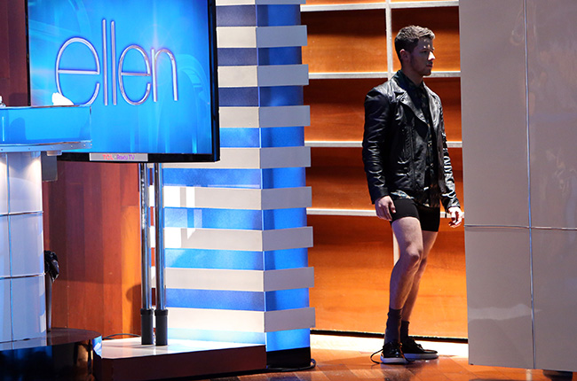 Nick Jonas is Back in His Underwear-Stopping by Ellen to perform ‘Jealous’ off his new self-titled album, Nick Jonas poked fun at his Flaunt cover shoot, hitting the stage in his underwear. Not one to show up completely naked, Jonas wore a leather biker’s jacket with a Marc Jacobs silk peacock print button-up shirt.