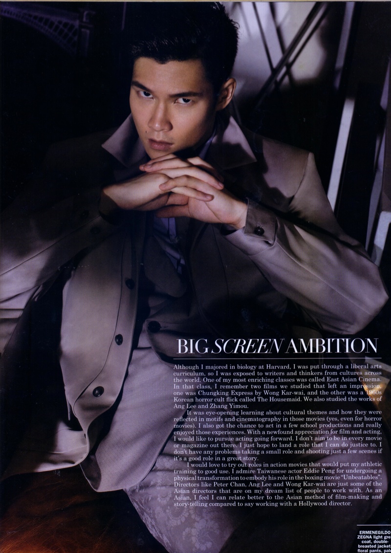 Big Screen Ambition–Model and aspiring actor, Nick Tan covers the April edition of Men’s Folio. Reuniting with photographer Cher Him, Tan is captured in spring/summer 2014 ensembles from Z Zegna and Ermenegildo Zegna. Posing for luxe images in Zegna’s modern silhouettes, the Harvard graduate opens up to the magazine about pursuing acting and the type of roles he would like.