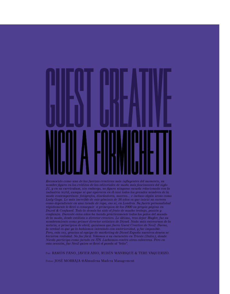 Formichetti’s New Moment–Diesel artistic director Nicola Formichetti graces the cover of the latest edition of Spanish magazine Neo2, appearing before the lens of photographer José Morraja. Accompanying the piece in which Formichetti discusses his life at Diesel, model Felix Radford steps into the studio to showcase the latest from the label as styled by Nirave. / Grooming by Anne Sophie Costa.