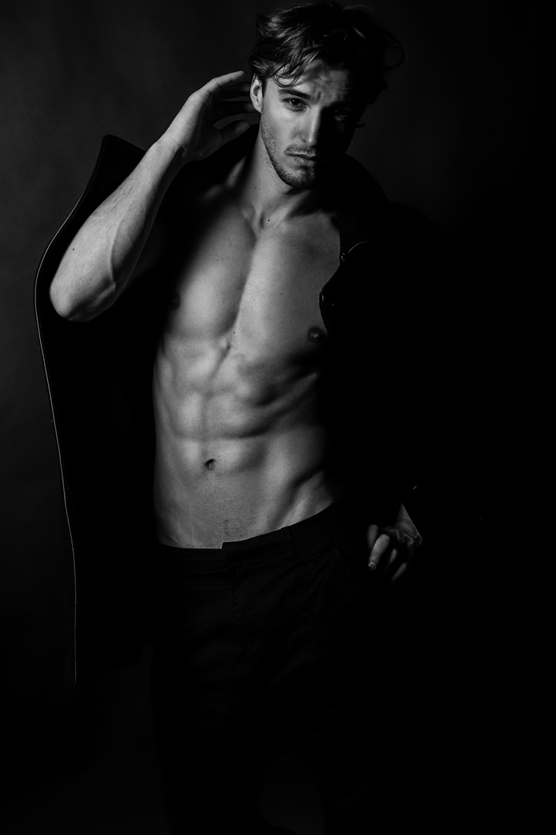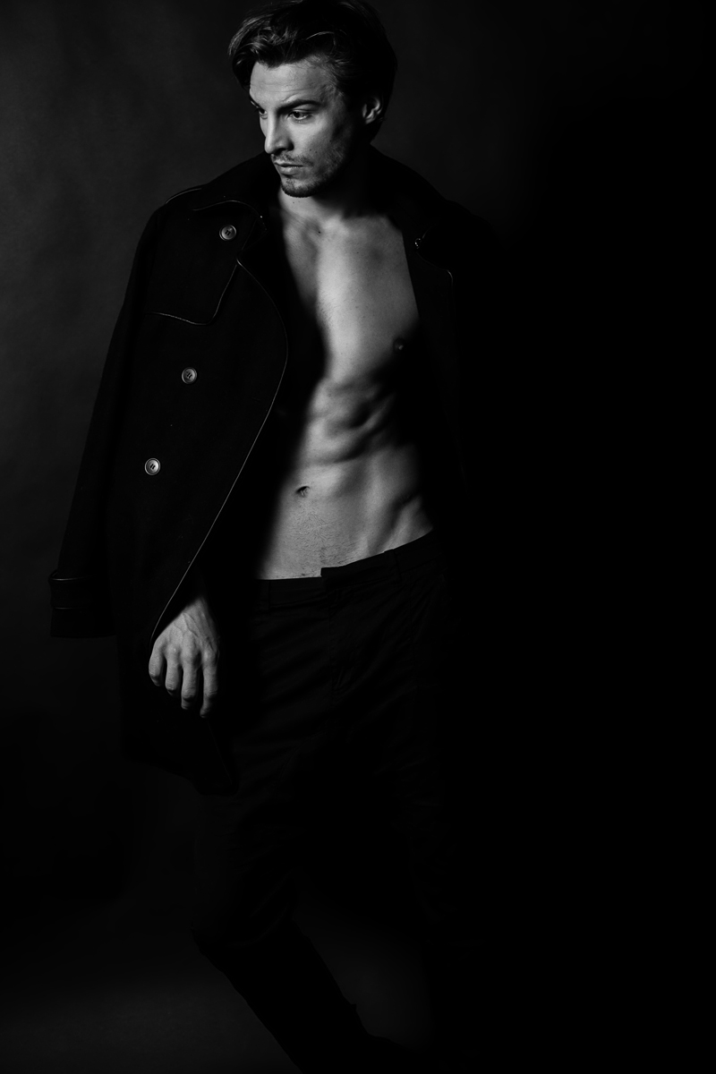 Simple Finesse–Showing off his sculpted looks and captivating gaze in a sultry set of monochromatic portraits, model Nikolai Danielson of New York Models delivers an effortless cool in front of photographer Léon Dash. Dressed simply in a military overcoat and sleek black trousers also styled by Dash, Nikolai exhibits his promise and versatility.