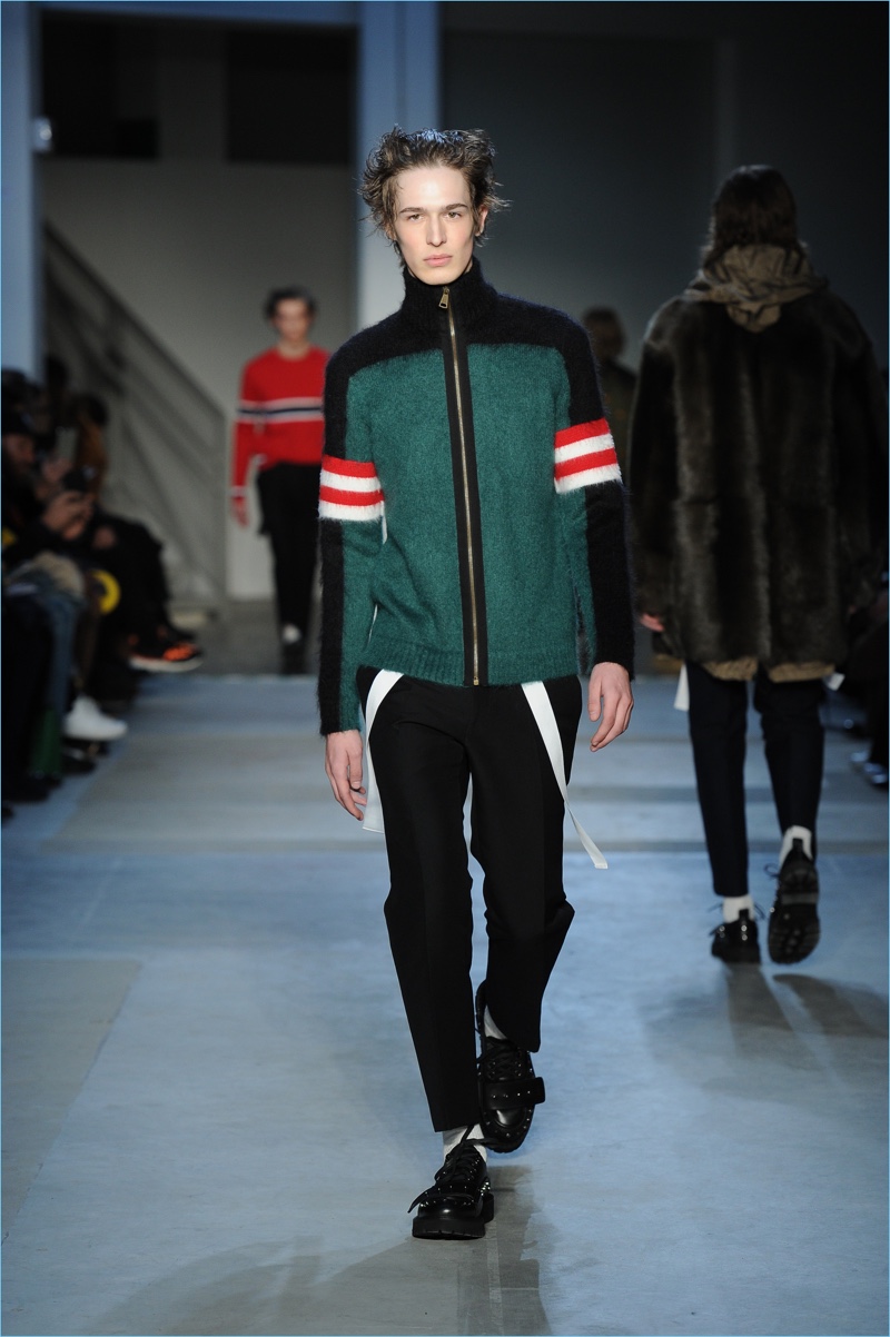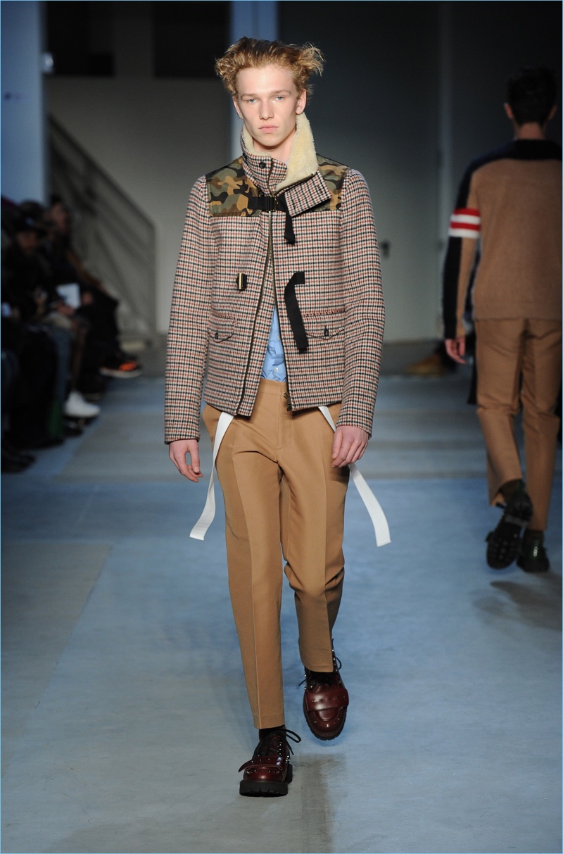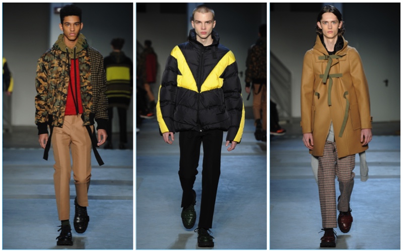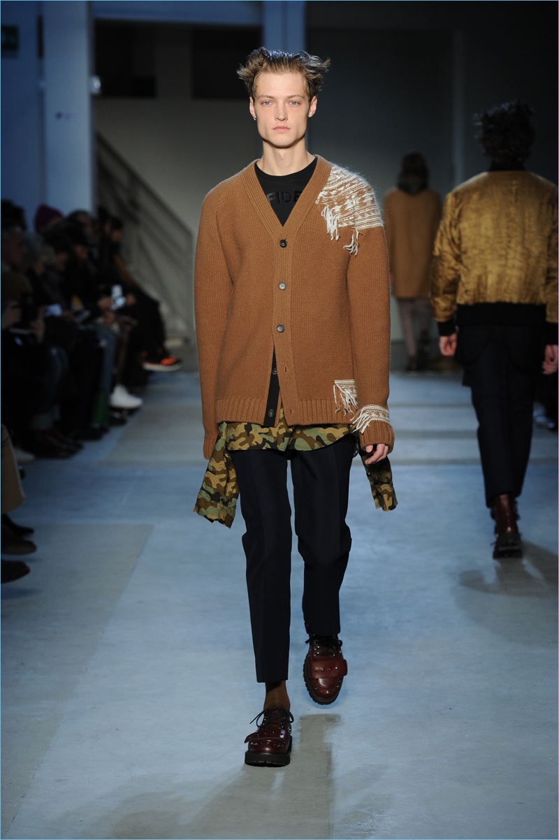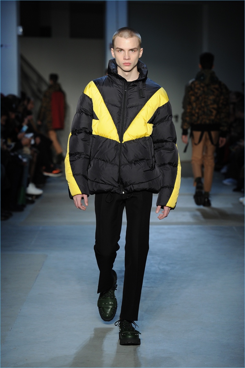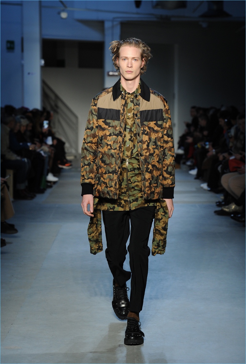Dell’Acqua’s skillful hand is shown with impactful details. While camouflage brings a military edge to outerwear, graphic bars decorate covetable items like a knit sweater or puffer jacket. Army nylon detailing also adds to the season’s conversational narrative.