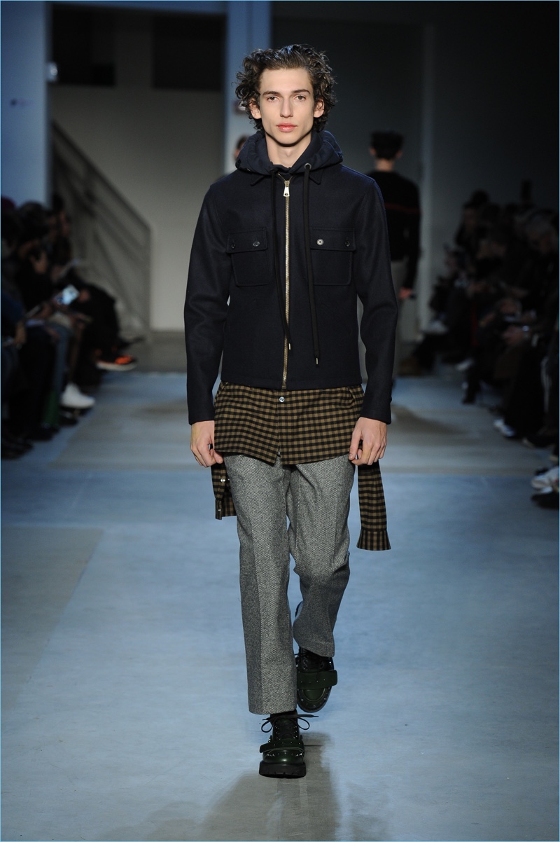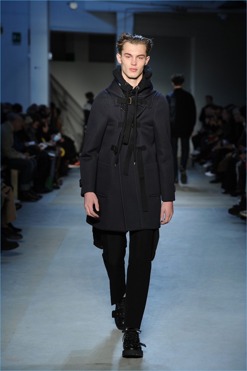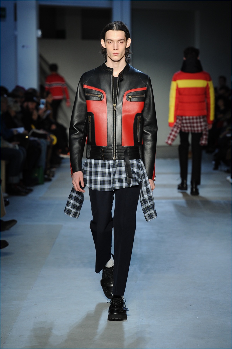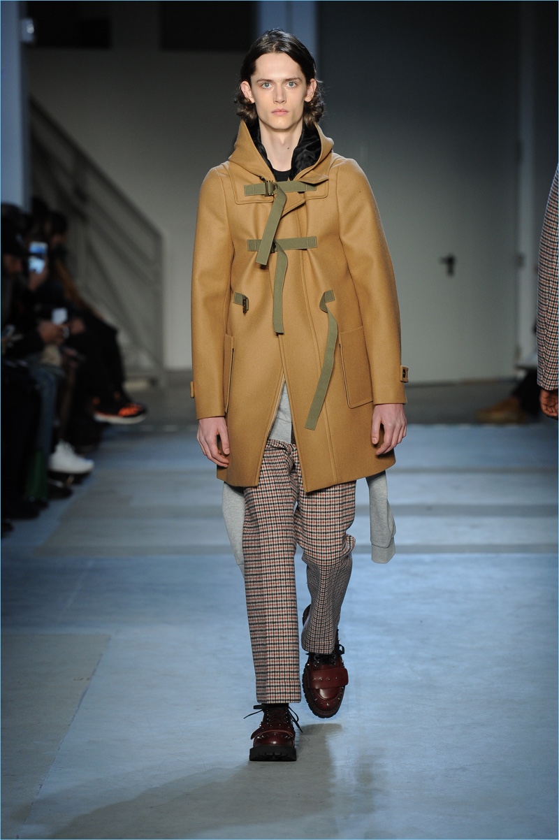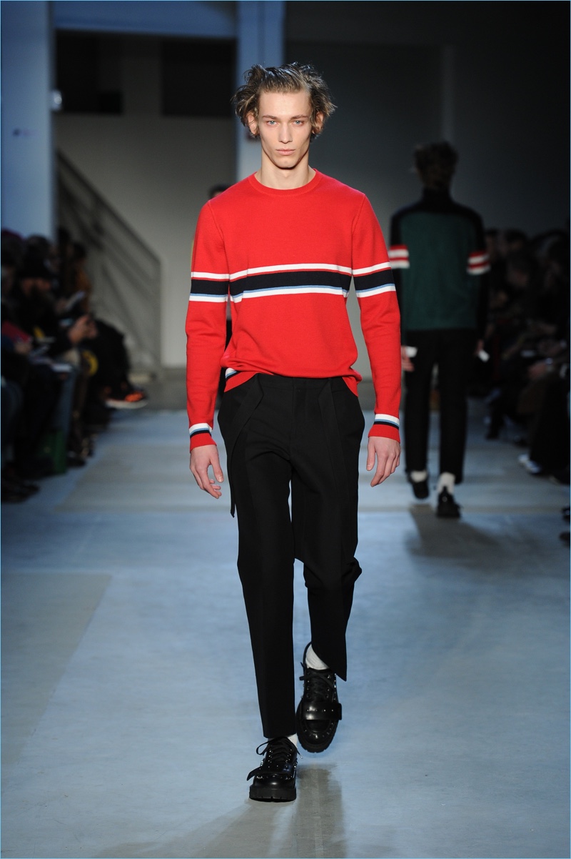 Dell’Acqua’s skillful hand is shown with impactful details. While camouflage brings a military edge to outerwear, graphic bars decorate covetable items like a knit sweater or puffer jacket. Army nylon detailing also adds to the season’s conversational narrative.