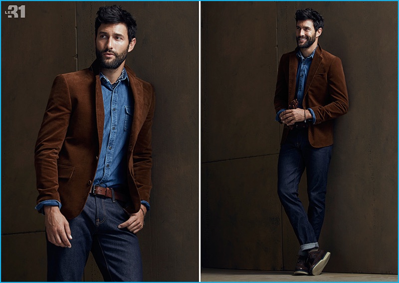 Modeling a double denim look, Noah Mills completes his look with a sport jacket.Pin
