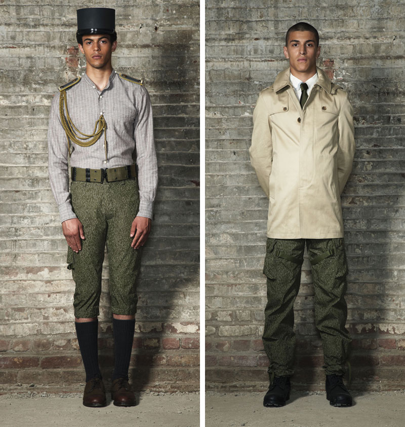 Nom de Guerre remains dedicated to further exploring a military motif as they move forward into the spring 2010 season. Entitled “The Combat Continues”, the tenth collection was inspired by “an examination of political oppression, rebellion and circumvention as illustrated by the colonizing of Algeria and the resulting Algerian War.” Merging the attire of civilian insurgency forces with the uniforms of the French colonial army, Nom de Guerre arrives at a hodgepodge of ideas similar to the journalistic film footage of Chris Marker. As camouflage moves to conceal functional uniform separates, desert-wear provides a soft foil that brings to surface the issue of humanity and equality. After all, “the intent of the collection is also, to highlight the significance of society–any society distinct from our own, particularly in oppression or upheaval…”