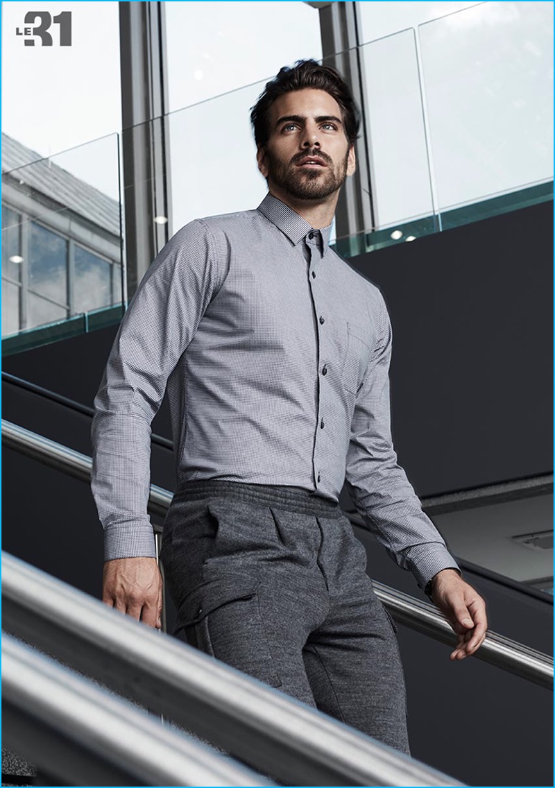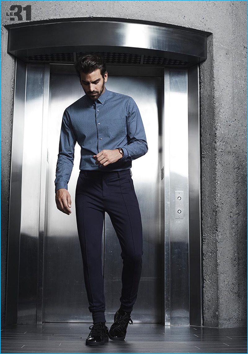 PinNyle DiMarco wears a semi-tailored fit shirt with chambray wool cargo joggers from LE 31 for Simons.