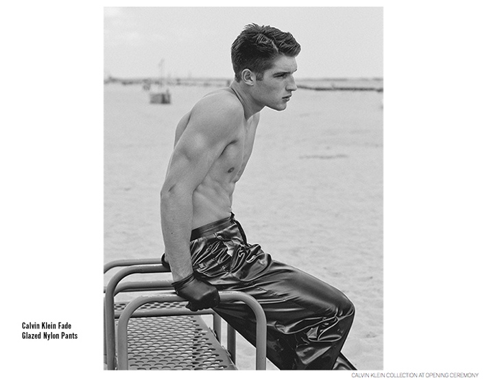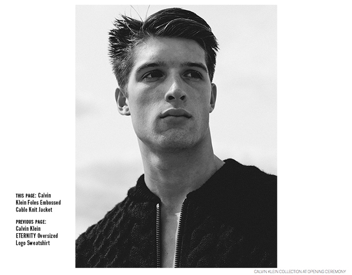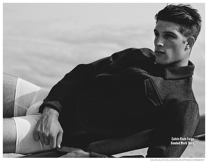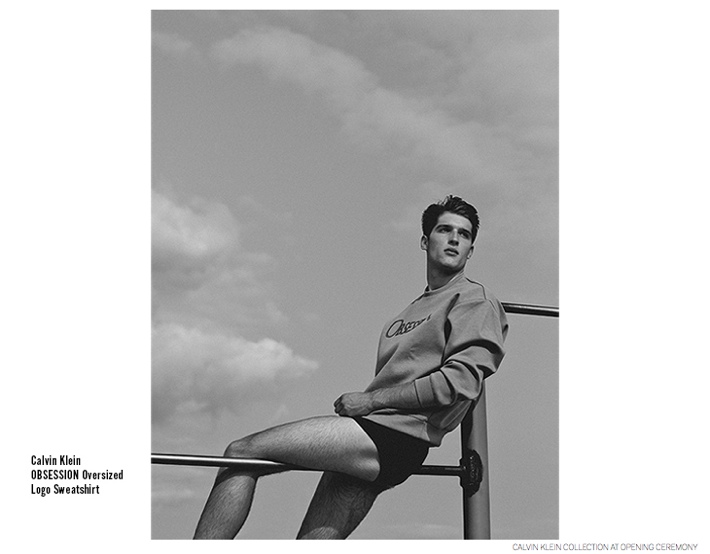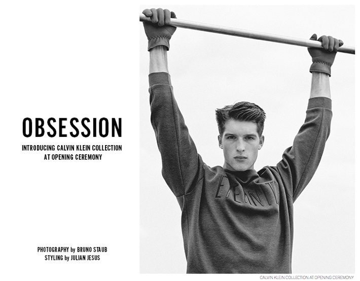 Obsession-Opening Ceremony welcomes Calvin Klein Collection to the roster of labels stocked in its stores. Celebrating with a new editorial lensed by photographer Bruno Staub, Calvin Klein’s minimal 90s aesthetic is championed. Simple black & white photos featuring model Zak Steiner capture the label’s fall/winter 2014 collection. Styled by Julian Jesus, Zac poses outdoors in must-have pieces from the latest range that include Eternity and Obsession sweatshirts, relaxed nylon pants, quilted jackets and other sporty separates.