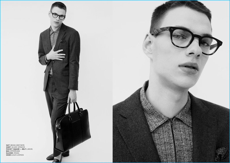 Dove Dainauskas tackles smart style in a Brooks Brothers suit and Zegna glasses for JÓN magazine.
