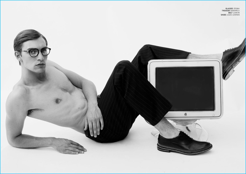 Going shirtless for JÓN magazine, George Le Page poses in Zegna glasses with Nanamica pinstripe trousers and studded Louis Leeman shoes.Pin