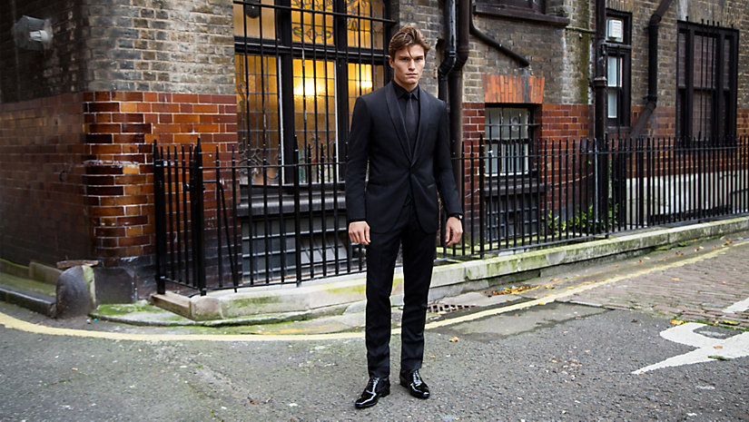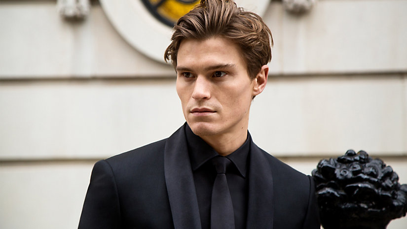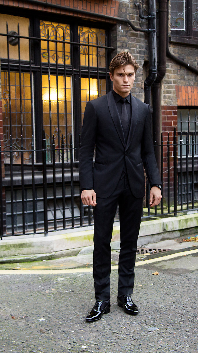 Oliver Cheshire goes formal with a black on black suiting ensemble.