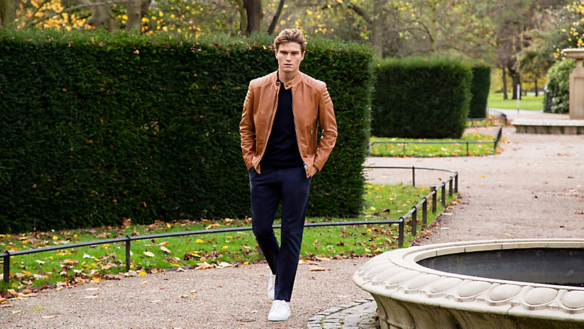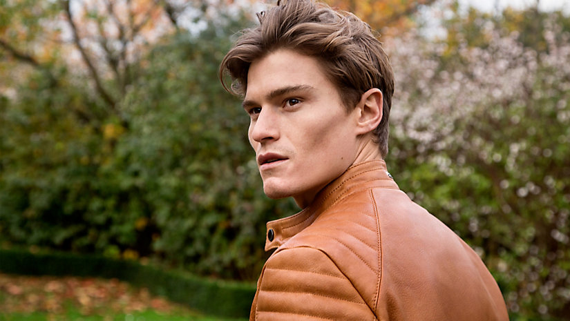 Oliver Cheshire is a casual vision in a brown leather moto jacket.